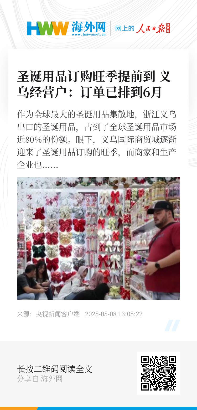 据了解,义乌拥有一条完整的圣诞用品生产、销售、包装的产业链,涵盖了圣诞玩具、圣诞树、圣诞服饰、圣诞灯饰等品种,而且新品开发速度快,采购商可以一站式买齐所有产品。许多经营户还借助AI制作视频,通过电商拓展更多市场。