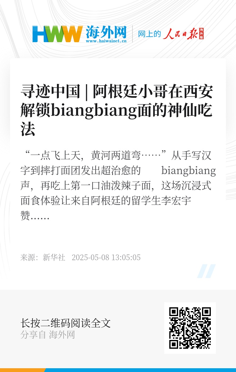 “一点飞上天,黄河两道弯……”从手写汉字到摔打面团发出超治愈的 biangbiang 声,再吃上第一口油泼辣子面,这场沉浸式面食体验让来自阿根廷的留学生李宏宇赞叹不已。快来跟着他的镜头,云尝这碗 “舌尖上的三秦大地”!
