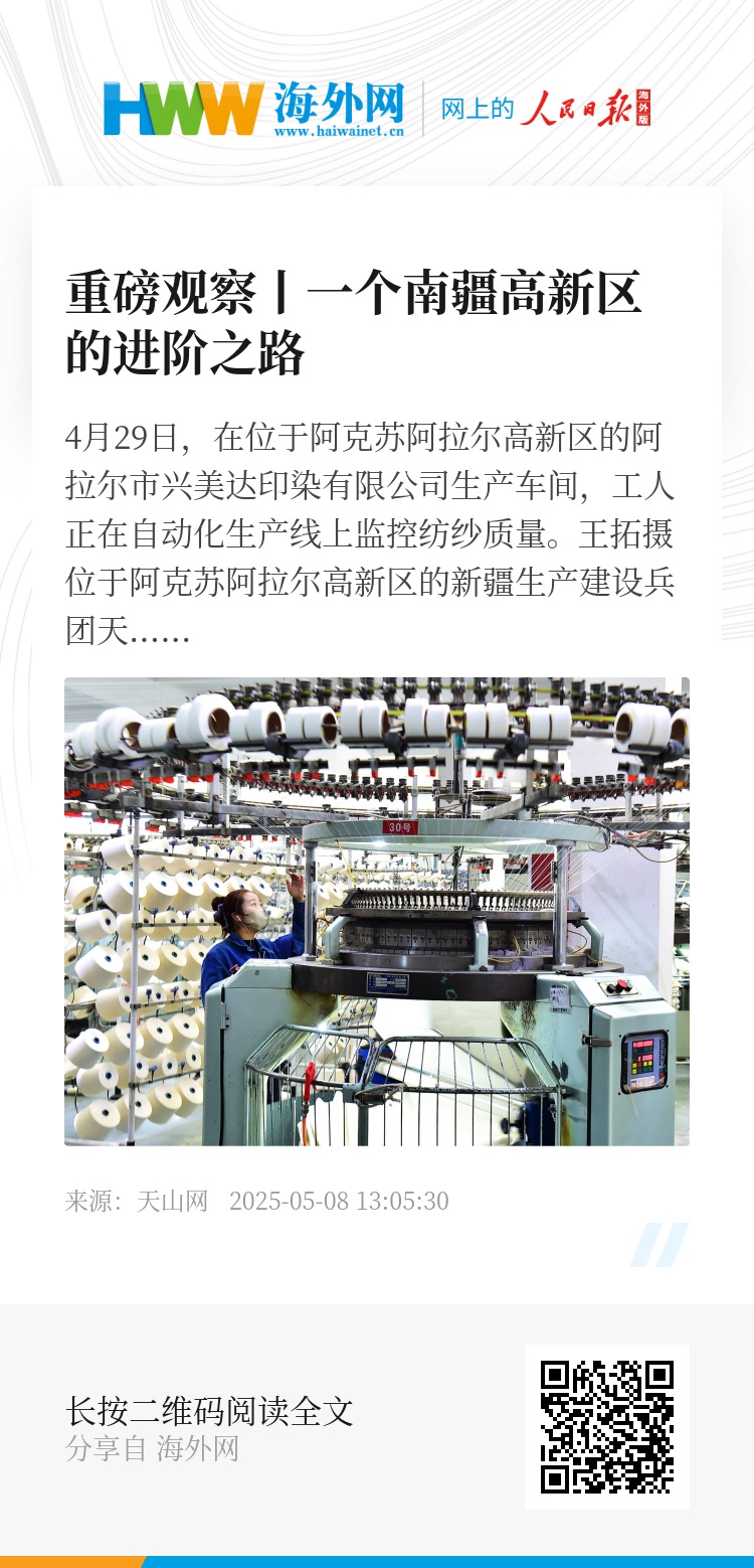这份“加速度”的成绩单背后,是瞄准国家战略,结合自身实际的不断探索。2023年6月,阿克苏阿拉尔高新区获国务院批复升级为国家级高新区,成为兵地联合共建的首个国家级高新技术产业开发区。当前,阿克苏阿拉尔高新区以“一特三新”即高端纺织为特色,精细化工、新能源新材料、高端装备制造为重点的现代产业体系为核心,初步走出了一条“生态优先、科技引领、兵地融合”的可持续发展路径。