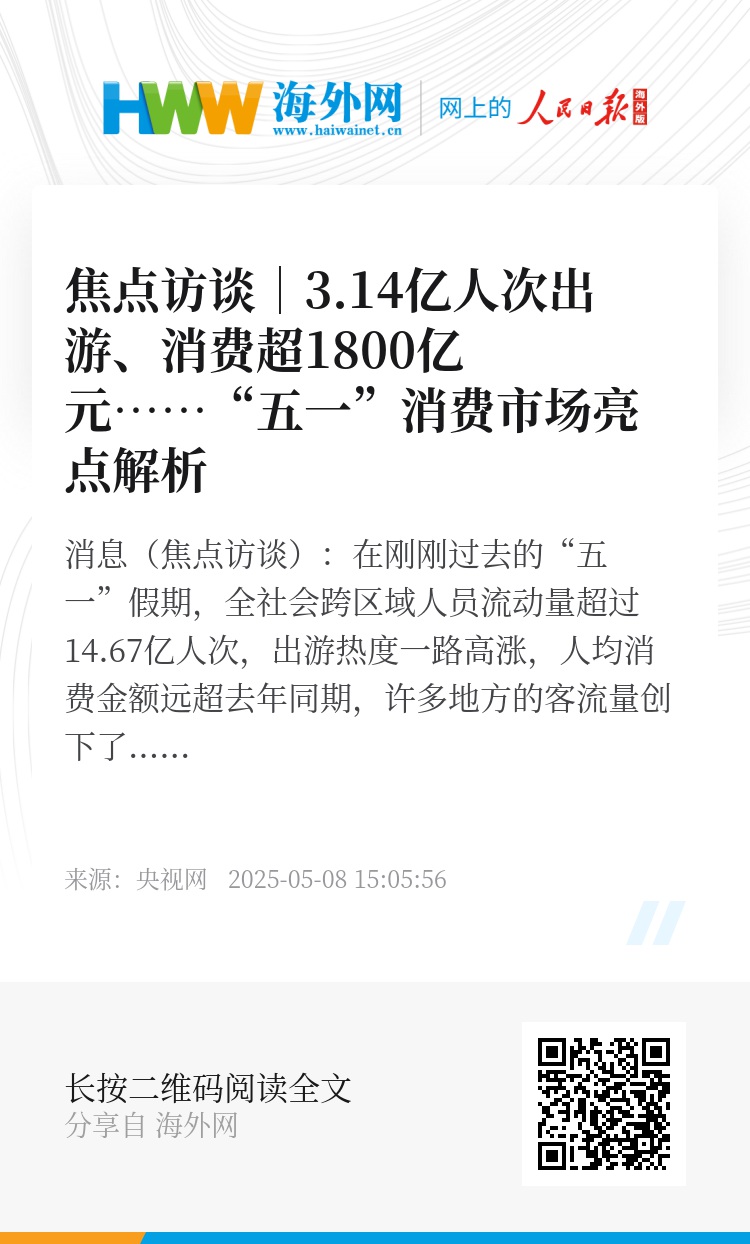央视网消息(焦点访谈):在刚刚过去的“五一”假期,全社会跨区域人员流动量超过14.67亿人次,出游热度一路高涨,人均消费金额远超去年同期,许多地方的客流量创下了历史新高。各类别出心裁的消费场景令人目不暇接,整个消费市场呈现出一片繁荣兴旺的景象。这背后,不仅是人们对美好生活的追求,更是中国经济强劲复苏、消费活力不断释放的生动体现。那么,这个“五一”假期的消费市场究竟有哪些亮点?又反映出怎样的经济趋势?