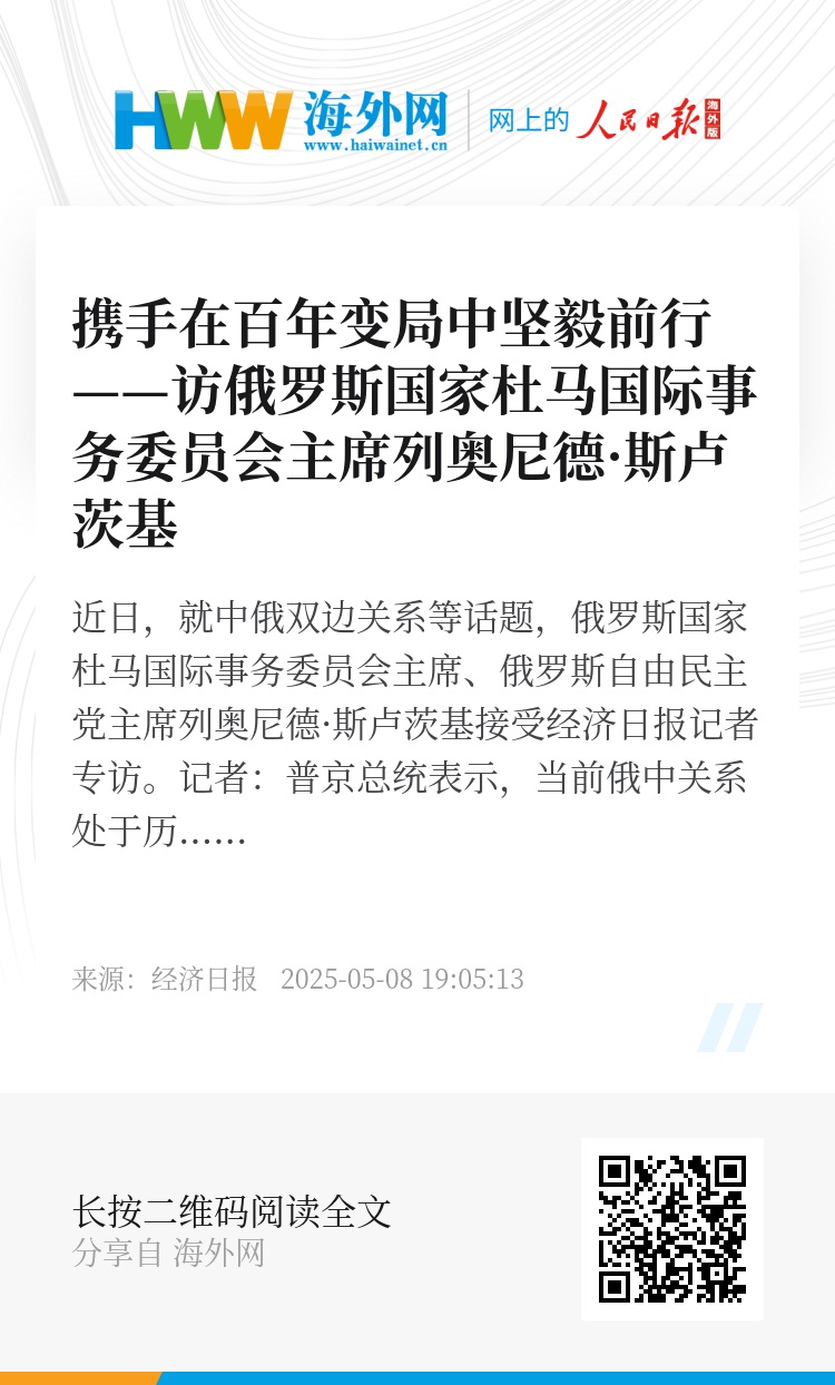 斯卢茨基:我相信中国领导人此访将为两国间的合作与互动开辟新的前景。它的举办时间恰逢俄罗斯全体民众最重要的节日——苏联人民伟大卫国战争胜利80周年,这具有深刻的象征意义。欧洲乃至亚洲的某些势力想要重新评价这场战争的结果,粉饰发动这场可怕战争的暴徒,只要回想一下联合国大会每次通过相关决议时发生的“口水战”就能明白,当前的形势依然严峻。