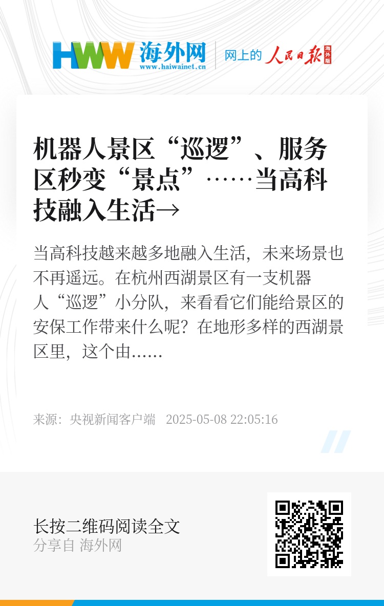 当高科技越来越多地融入生活,未来场景也不再遥远。在杭州西湖景区有一支机器人“巡逻”小分队,来看看它们能给景区的安保工作带来什么呢?