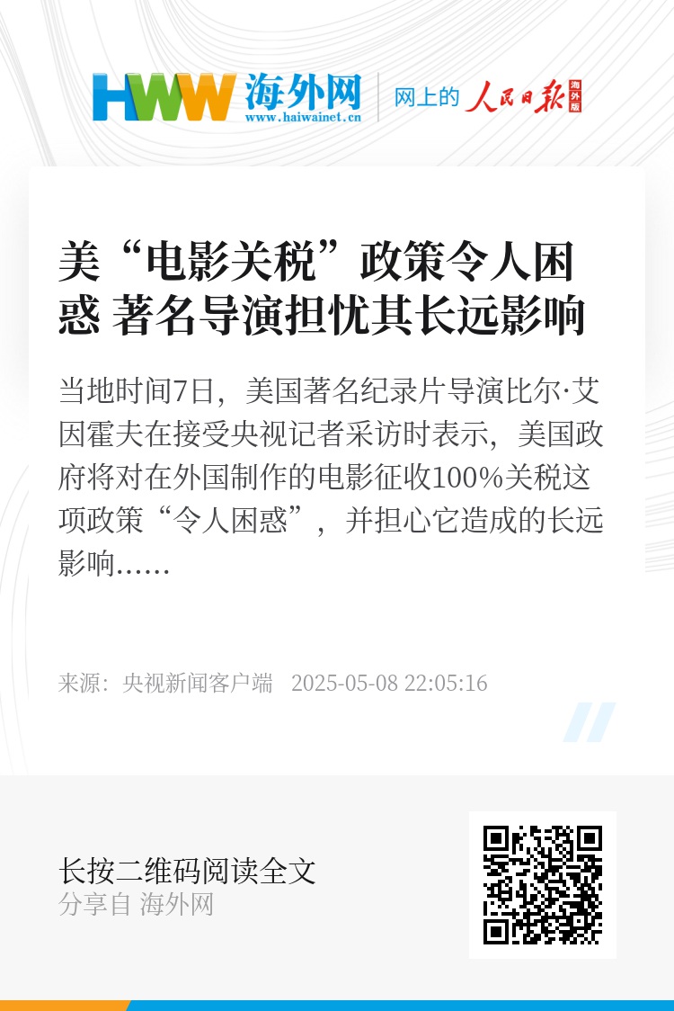 当地时间7日,美国著名纪录片导演比尔·艾因霍夫在接受央视记者采访时表示,美国政府将对在外国制作的电影征收100%关税这项政策“令人困惑”,并担心它造成的长远影响。