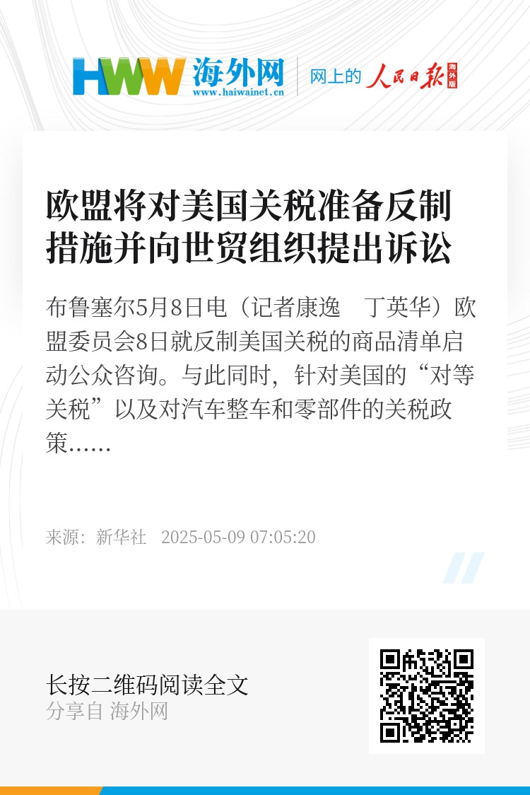 新华社布鲁塞尔5月8日电(记者康逸 丁英华)欧盟委员会8日就反制美国关税的商品清单启动公众咨询。与此同时,针对美国的“对等关税”以及对汽车整车和零部件的关税政策,欧盟将向世贸组织提起诉讼。