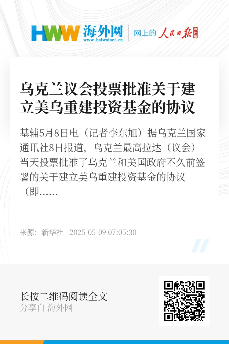 新华社基辅5月8日电(记者李东旭)据乌克兰国家通讯社8日报道,乌克兰最高拉达(议会)当天投票批准了乌克兰和美国政府不久前签署的关于建立美乌重建投资基金的协议(即美乌矿产协议)。
