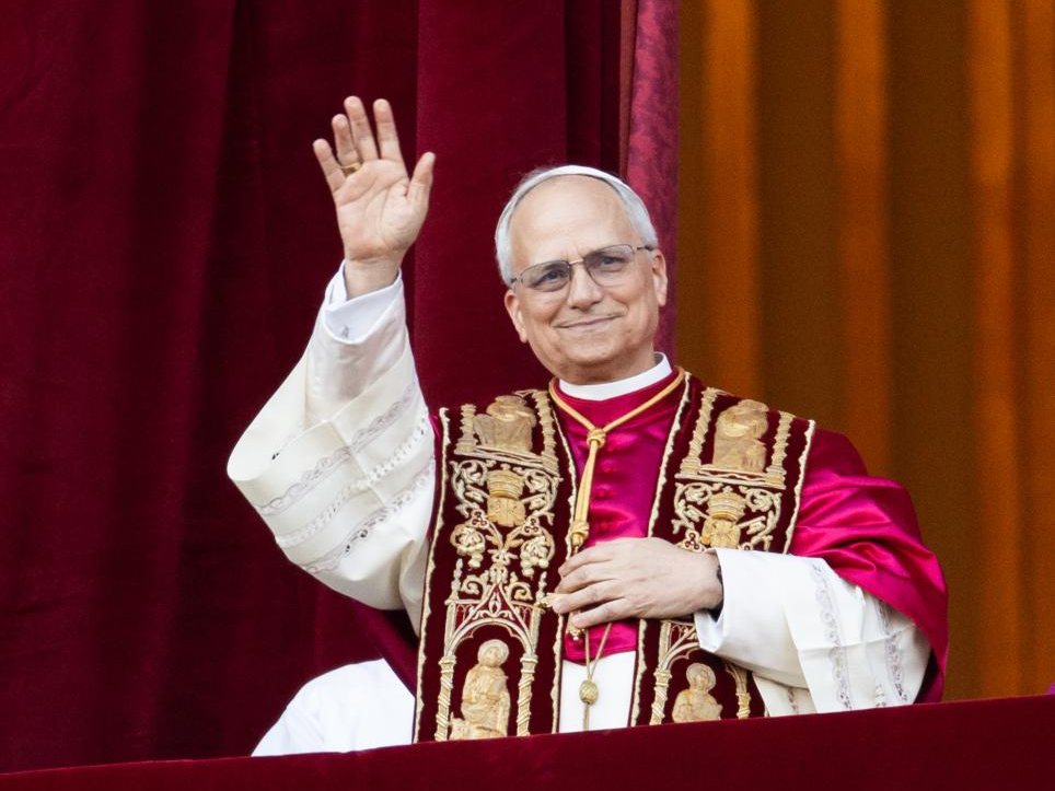 5月8日,在梵蒂冈城,来自美国的枢机主教罗伯特·普雷沃斯特当选新一任天主教罗马教皇后向民众致意。新华社记者 李京 摄