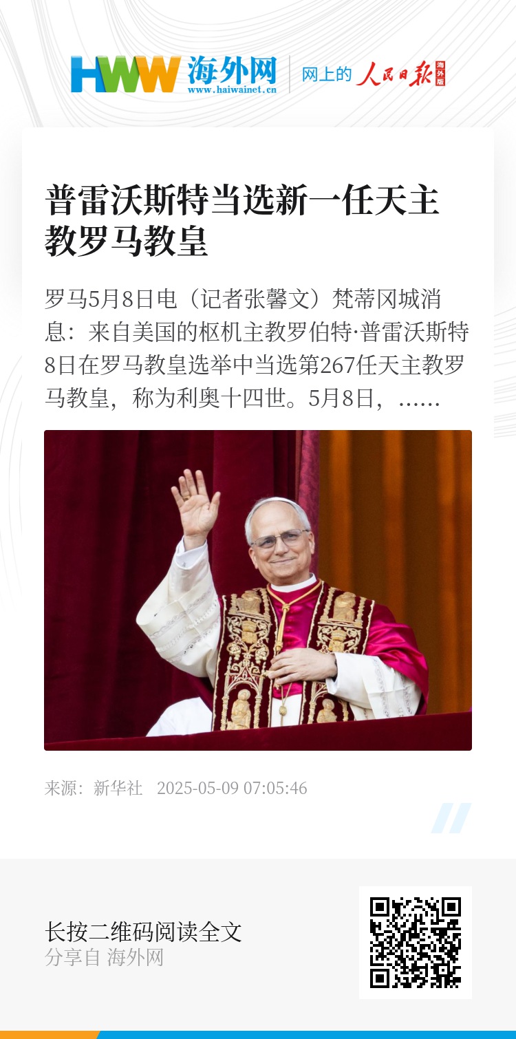 新华社罗马5月8日电(记者张馨文)梵蒂冈城消息:来自美国的枢机主教罗伯特·普雷沃斯特8日在罗马教皇选举中当选第267任天主教罗马教皇,称为利奥十四世。