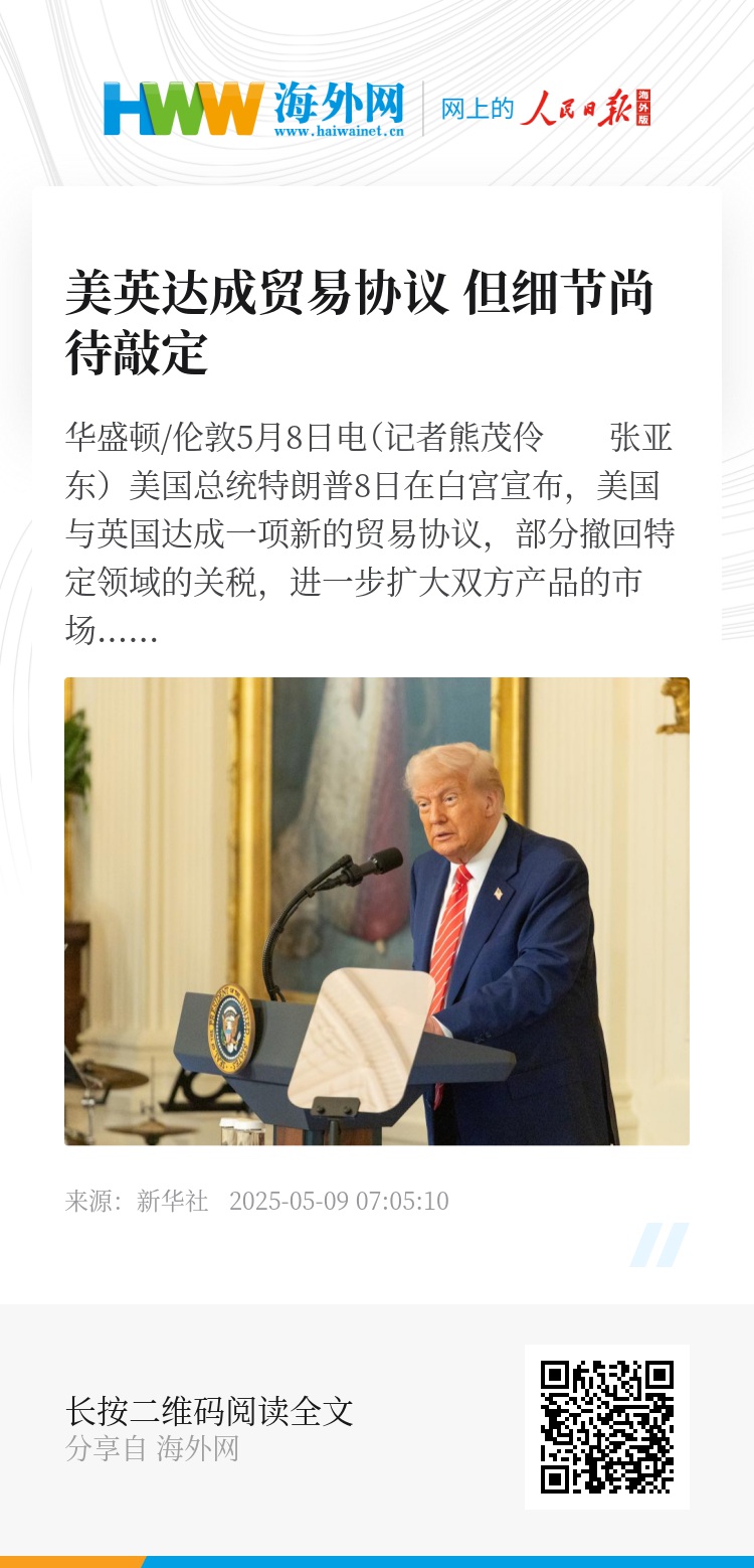 新华社华盛顿/伦敦5月8日电(记者熊茂伶 张亚东)美国总统特朗普8日在白宫宣布,美国与英国达成一项新的贸易协议,部分撤回特定领域的关税,进一步扩大双方产品的市场准入。然而,协议的诸多细节尚待敲定,美方此前加征的10%所谓“对等关税”也未取消。