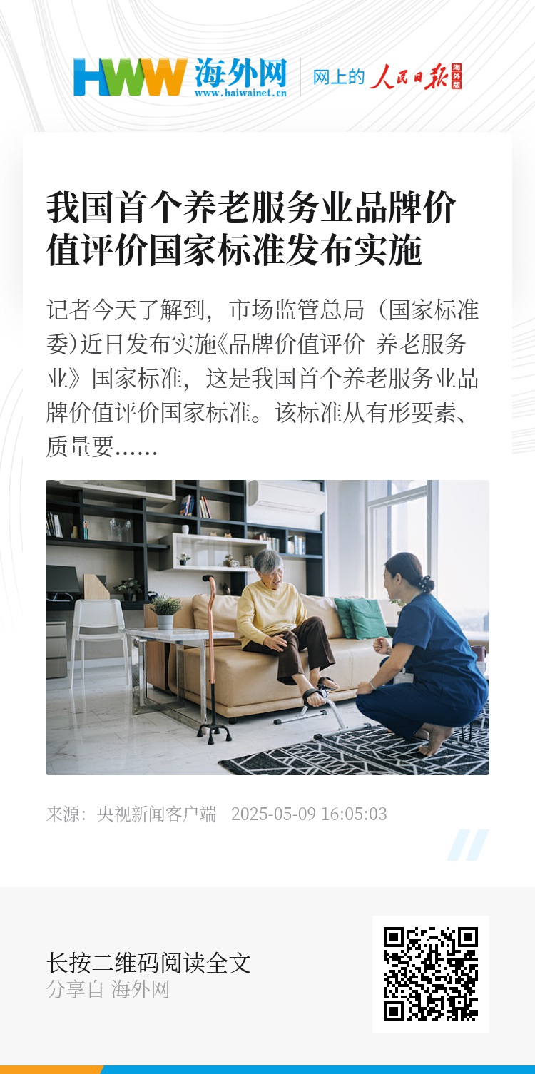 该标准从有形要素、质量要素、创新要素、服务要素、无形要素5个方面,细化给出衡量我国养老服务业品牌强度的46个指标,提出了开展养老服务业品牌价值评价的模型、方法和流程,为科学规范开展养老服务业品牌价值评价提供指引。该标准的实施有助于引领养老服务机构不断提升服务质量、培育服务品牌,更好满足老年人日益增长的多层次、高品质养老需求。(总台央视记者 李晶晶)