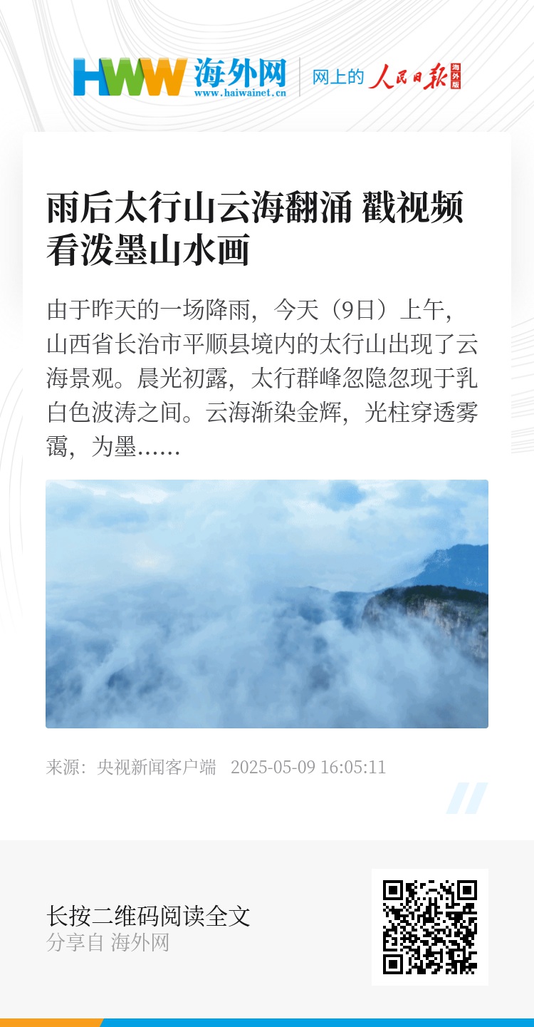 由于昨天的一场降雨,今天(9日)上午,山西省长治市平顺县境内的太行山出现了云海景观。晨光初露,太行群峰忽隐忽现于乳白色波涛之间。云海渐染金辉,光柱穿透雾霭,为墨色松林勾出毛边。远处山脊线在蒸腾的水汽中微微颤动,仿如水墨长卷。戳视频↑ (总台记者 王跃军 王曦 张玉阶)