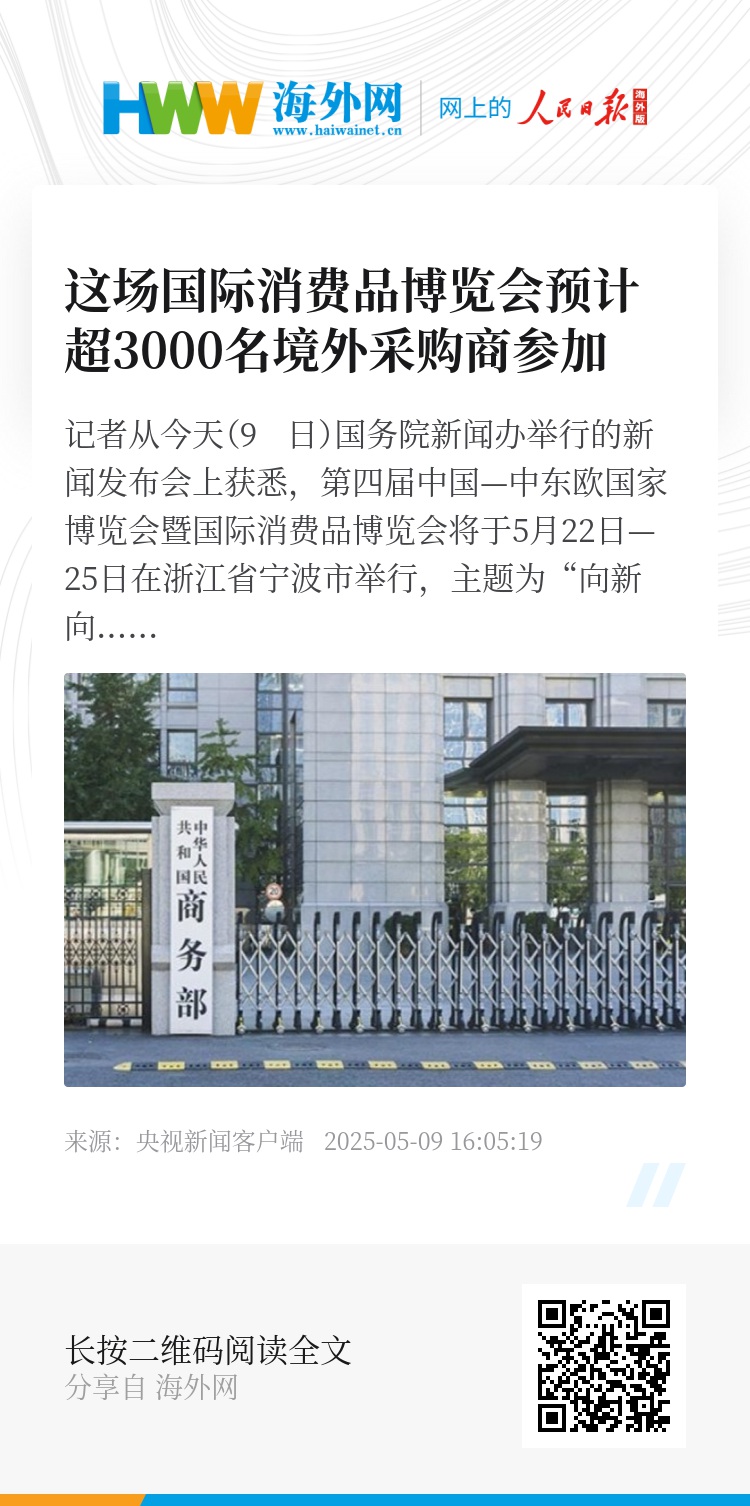 记者从今天(9 日)国务院新闻办举行的新闻发布会上获悉,第四届中国—中东欧国家博览会暨国际消费品博览会将于5月22日—25日在浙江省宁波市举行,主题为“向新 向实 向未来”。本届博览会安排中东欧展区2万平方米,邀请400多家展商参展,展区面积和展商数量均创新高。届时,捷克啤酒、斯洛文尼亚蜂蜜等8000多种中东欧特色商品将集中亮相。预计吸引1.5万名专业观众参加博览会,其中境外采购商超3000人。