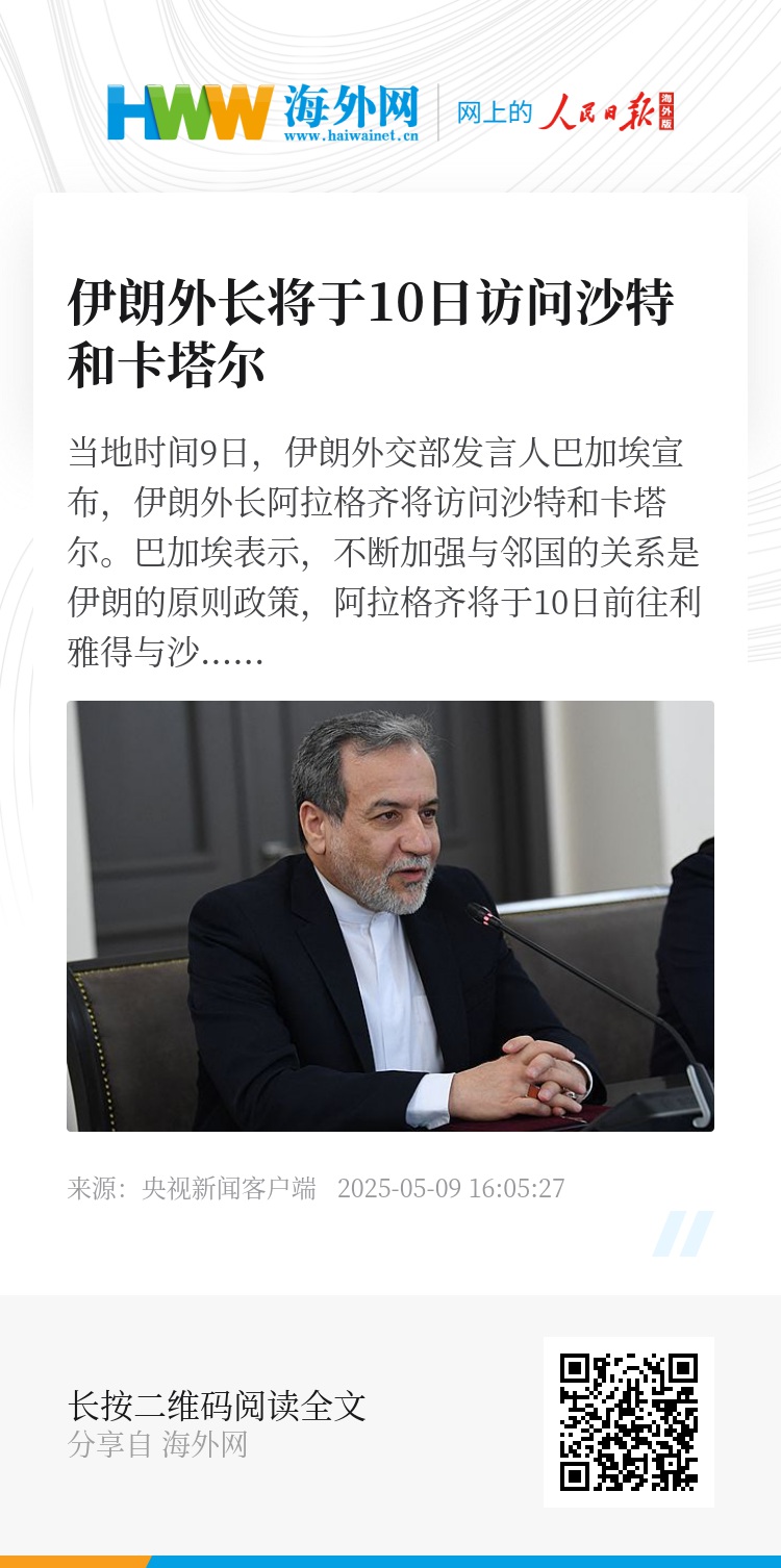 当地时间9日,伊朗外交部发言人巴加埃宣布,伊朗外长阿拉格齐将访问沙特和卡塔尔。