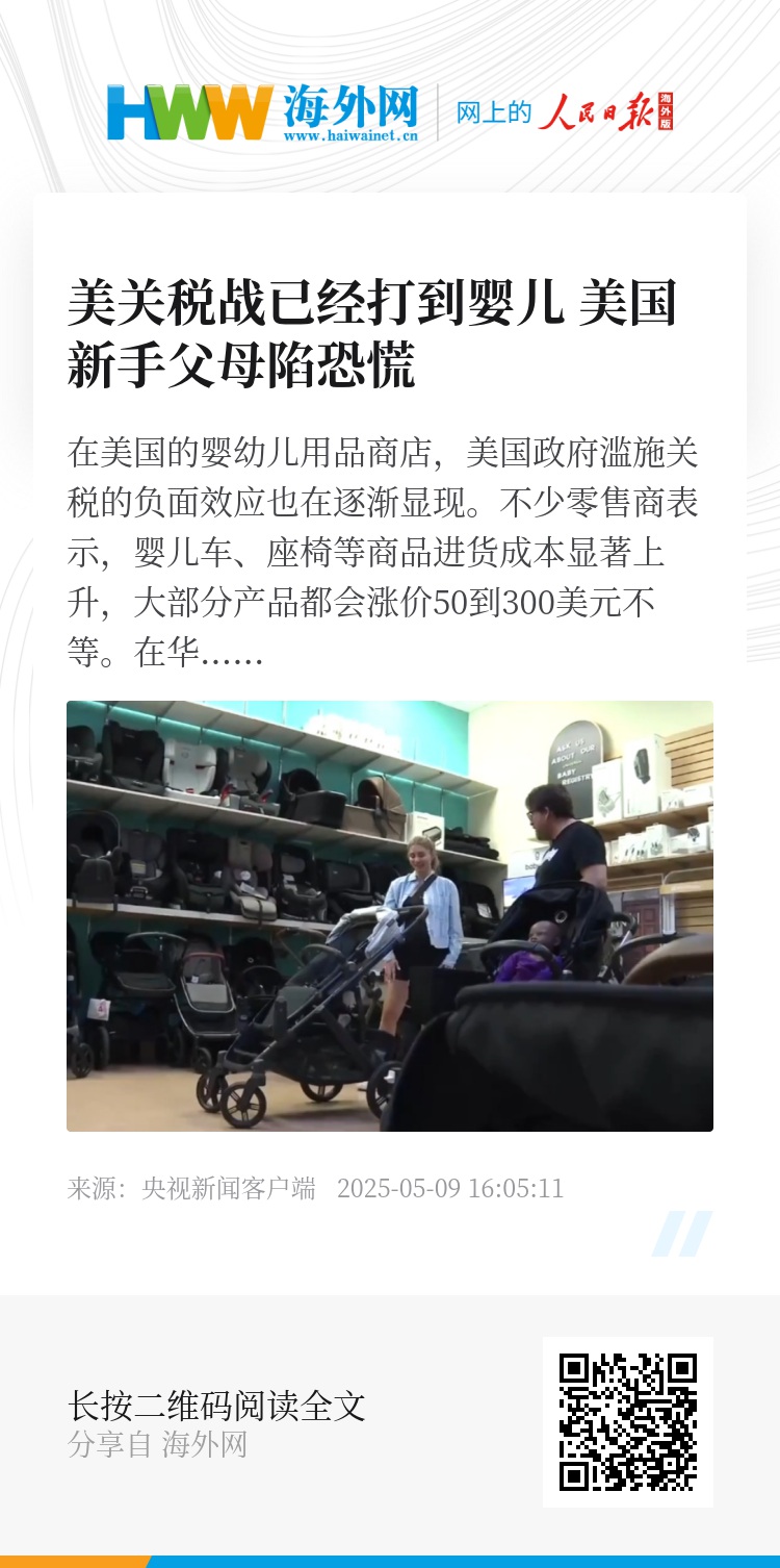 在美国的婴幼儿用品商店,美国政府滥施关税的负面效应也在逐渐显现。不少零售商表示,婴儿车、座椅等商品进货成本显著上升,大部分产品都会涨价50到300美元不等。