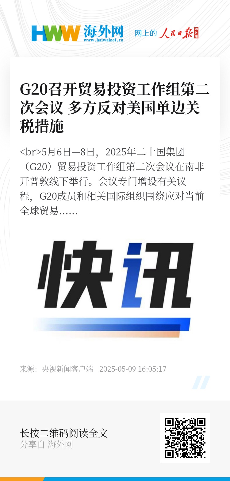 5月6日—8日,2025年二十国集团(G20)贸易投资工作组第二次会议在南非开普敦线下举行。会议专门增设有关议程,G20成员和相关国际组织围绕应对当前全球贸易挑战、面向未来的贸易议程等进行讨论。