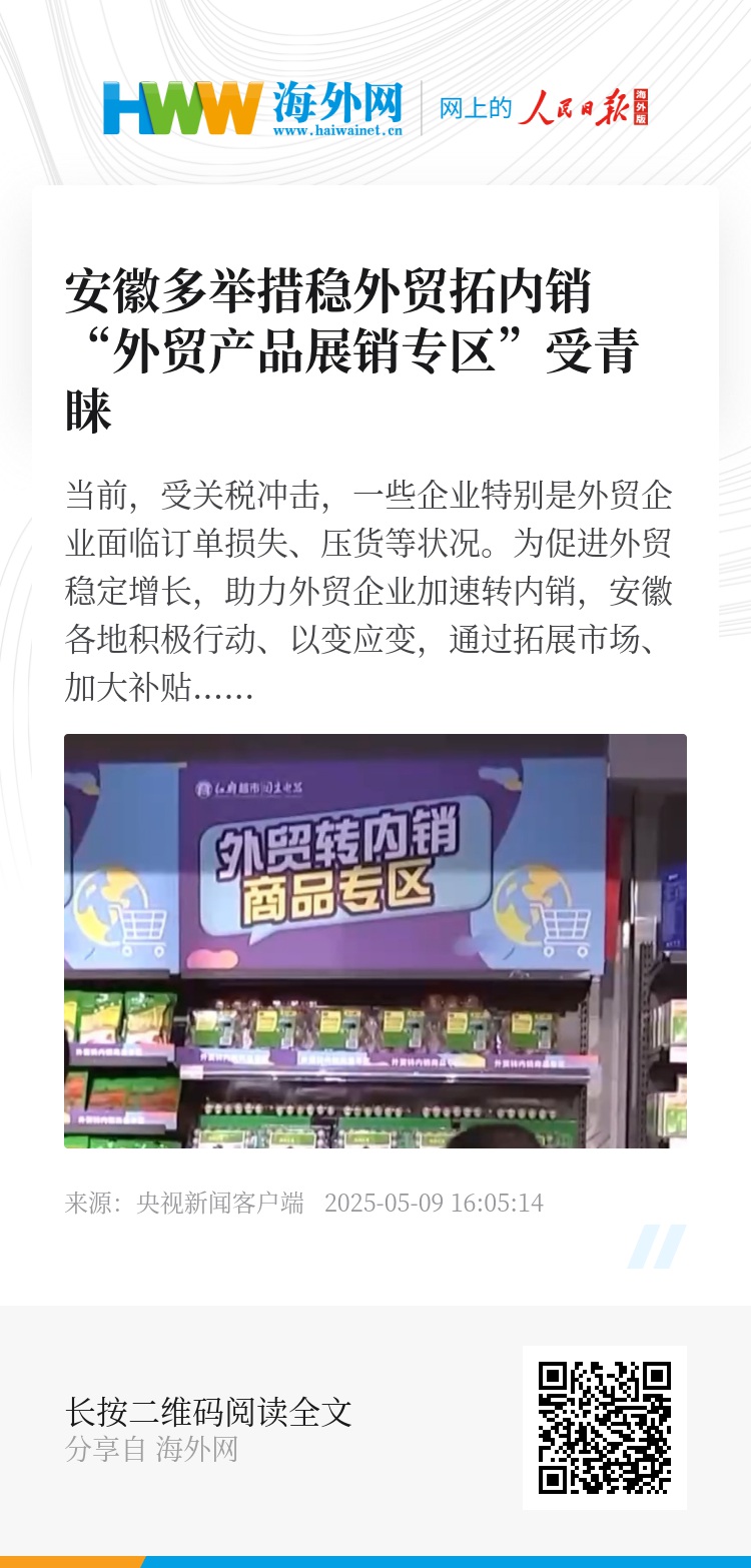 当前,受关税冲击,一些企业特别是外贸企业面临订单损失、压货等状况。为促进外贸稳定增长,助力外贸企业加速转内销,安徽各地积极行动、以变应变,通过拓展市场、加大补贴等一系列举措,助力外贸企业发展。
