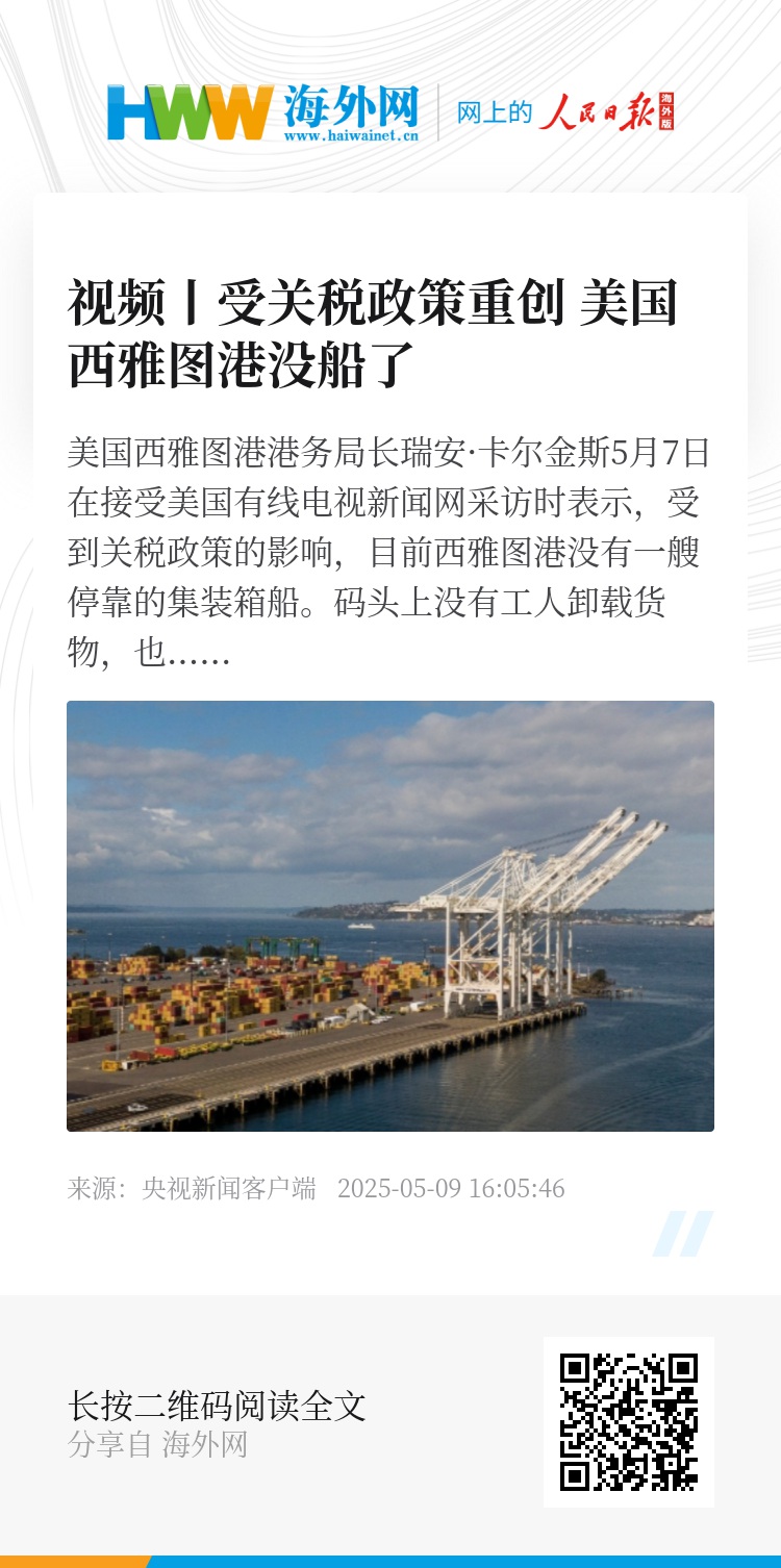 美国西雅图港港务局长瑞安·卡尔金斯5月7日在接受美国有线电视新闻网采访时表示,受到关税政策的影响,目前西雅图港没有一艘停靠的集装箱船。码头上没有工人卸载货物,也没有火车把货物运往内陆港口,这是非常不寻常的情况。