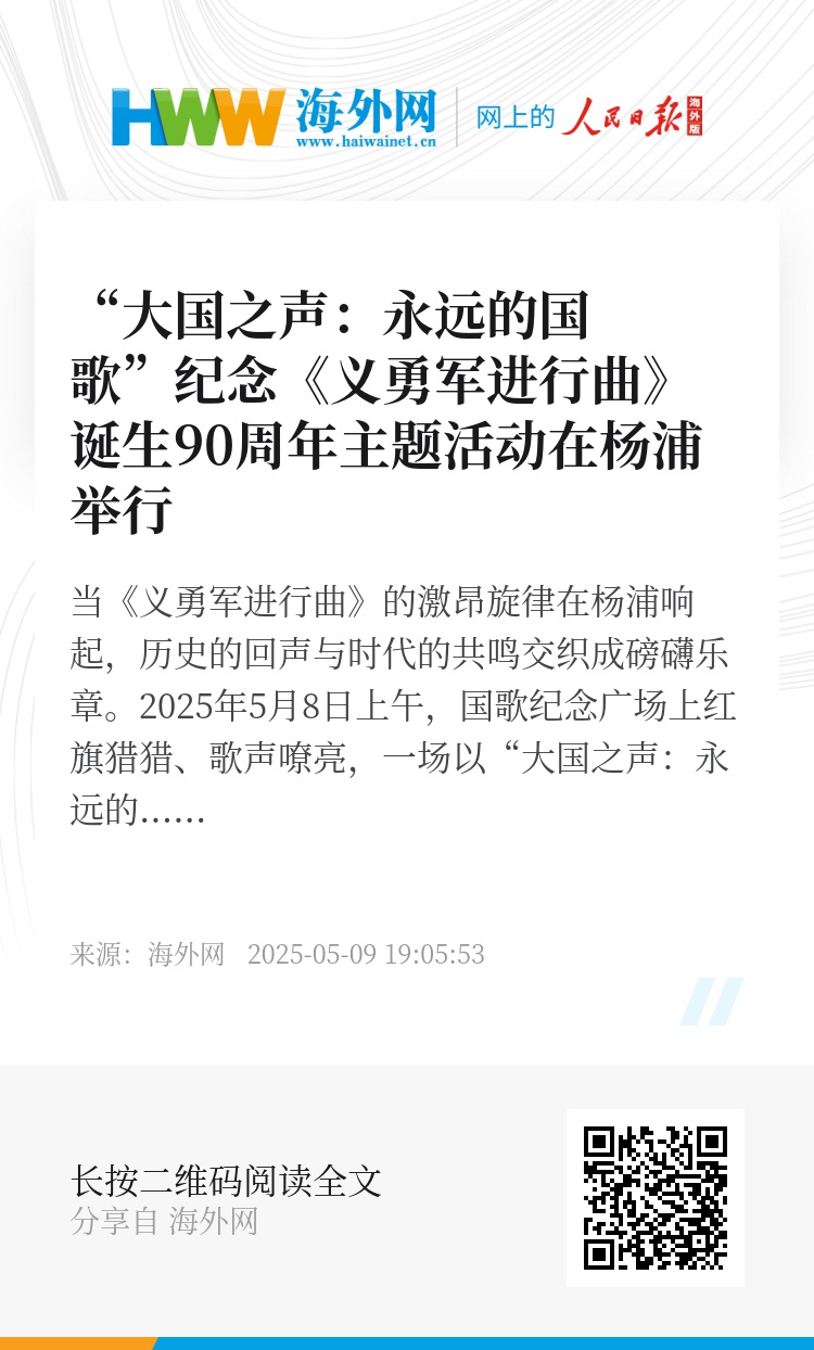 当《义勇军进行曲》的激昂旋律在杨浦响起,历史的回声与时代的共鸣交织成磅礴乐章。2025年5月8日上午,国歌纪念广场上红旗猎猎、歌声嘹亮,一场以“大国之声:永远的国歌”为主题的纪念《义勇军进行曲》诞生90周年活动在此举行。《义勇军进行曲》创作者后人、党史专家、上海革命场馆联盟单位及词曲作者的故乡湖南长沙、云南玉溪场馆代表与杨浦社会各界共同追忆国歌诞生的峥嵘岁月,纪念《义勇军进行曲》词谱问世的重要时刻,以铭记致敬未来,唱响“永远的时代强音”。