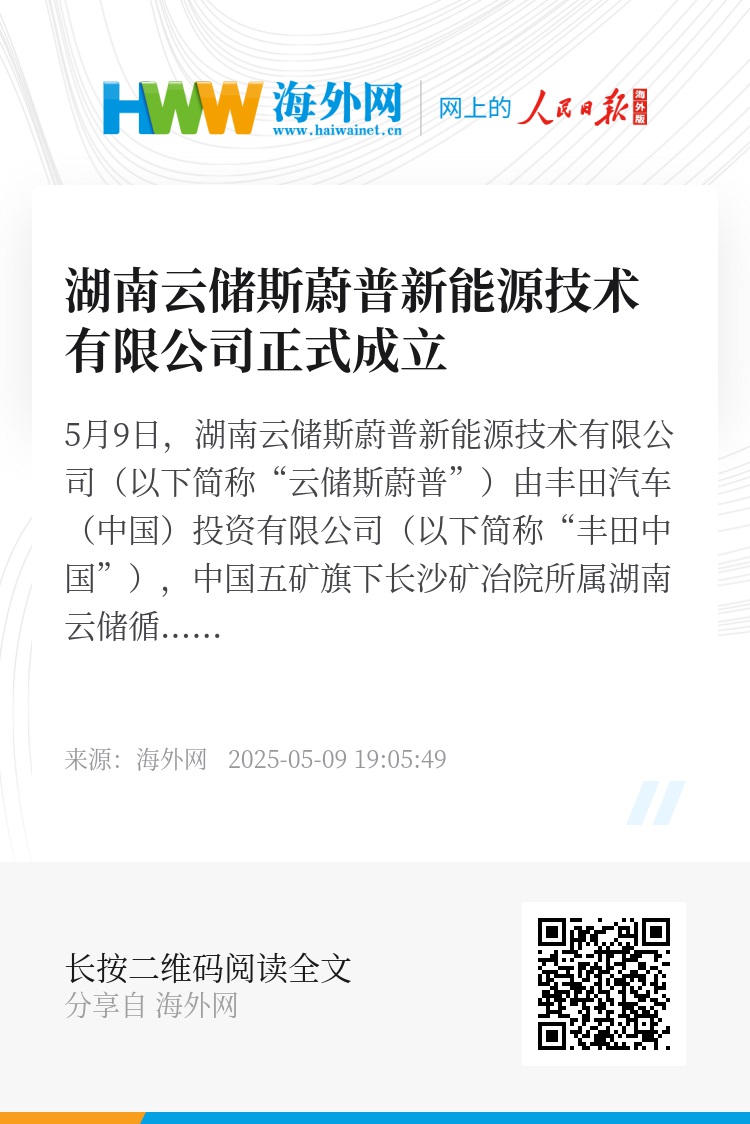 5月9日,湖南云储斯蔚普新能源技术有限公司(以下简称“云储斯蔚普”)由丰田汽车(中国)投资有限公司(以下简称“丰田中国”),中国五矿旗下长沙矿冶院所属湖南云储循环新能源科技有限公司、五矿新能源材料(湖南)股份有限公司,明和产业(上海)有限公司共同出资成立,注册资本共计1亿元。