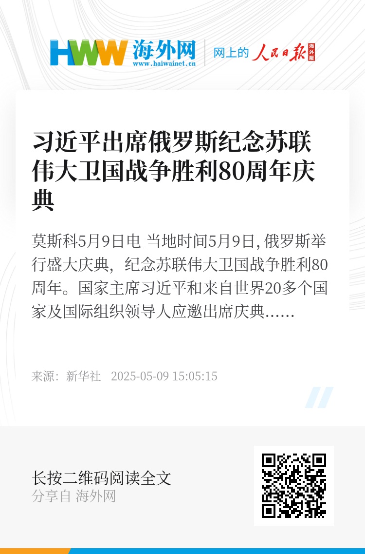 当地时间5月9日,俄罗斯举行盛大庆典,纪念苏联伟大卫国战争胜利80周年。国家主席习近平和来自世界20多个国家及国际组织领导人应邀出席庆典。
