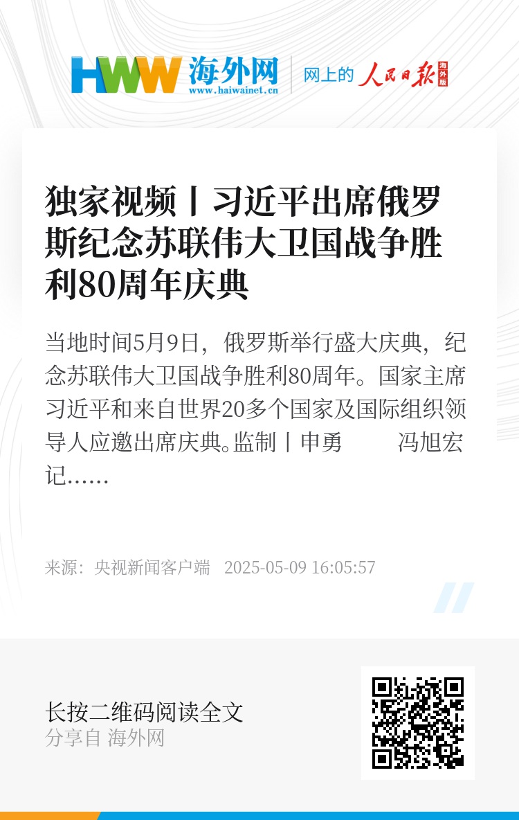 当地时间5月9日,俄罗斯举行盛大庆典,纪念苏联伟大卫国战争胜利80周年。国家主席习近平和来自世界20多个国家及国际组织领导人应邀出席庆典。