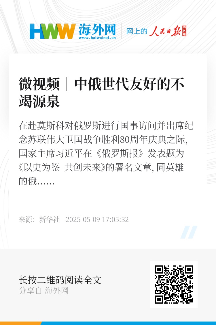 在赴莫斯科对俄罗斯进行国事访问并出席纪念苏联伟大卫国战争胜利80周年庆典之际,国家主席习近平在《俄罗斯报》发表题为《以史为鉴 共创未来》的署名文章,同英雄的俄罗斯人民一道重温历史、缅怀先烈。