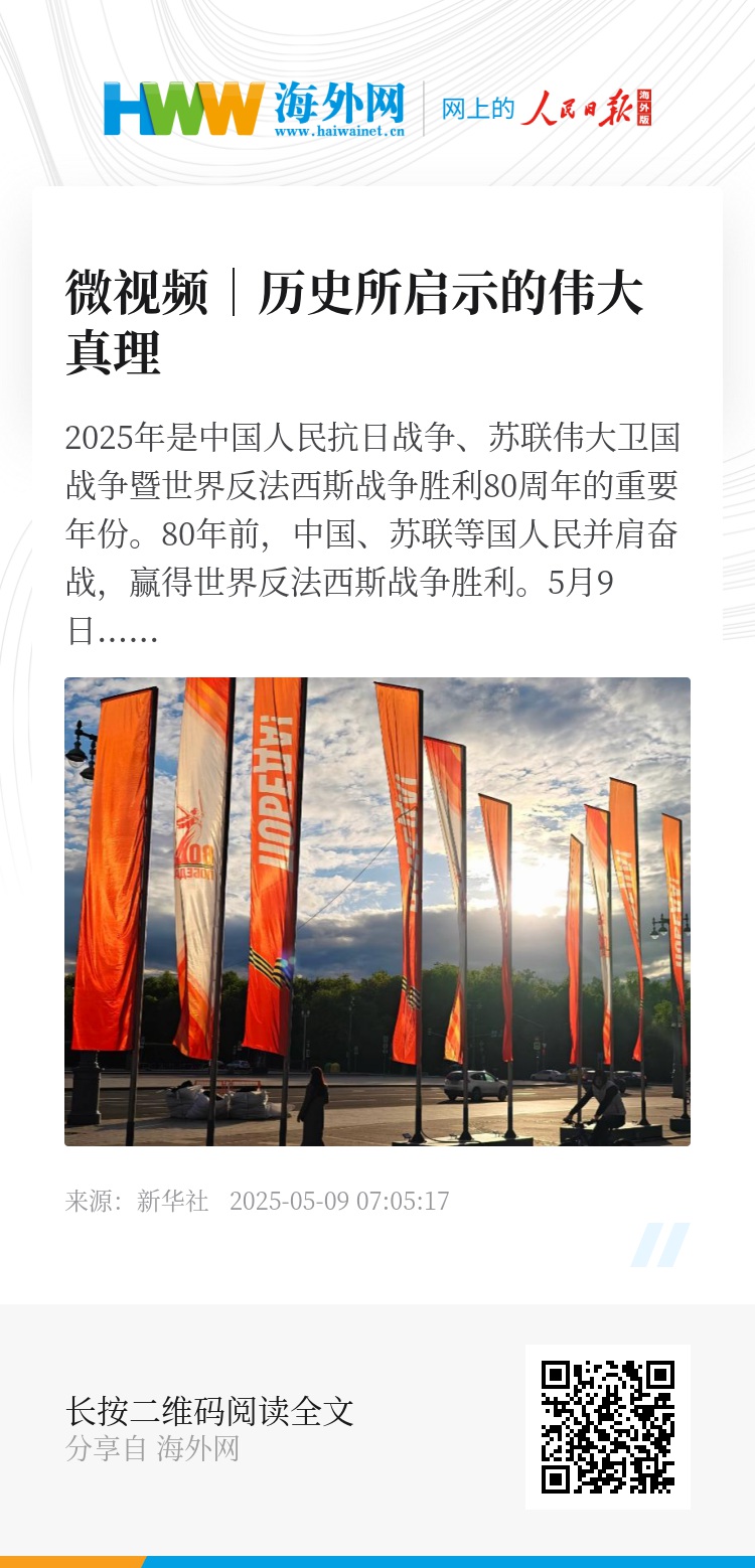 以必胜的信念联结历史与未来,让和平发展的时代潮流更加澎湃有力。站在承前启后的时间节点上,中国和俄罗斯将同世界上爱好和平、坚守正义的国家和人民一道,沿着构建人类命运共同体的正道阔步前行,携手开创更加美好的明天。