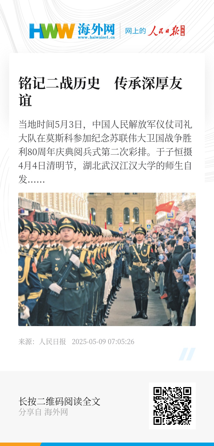 在“梨花开遍了天涯”的季节,习近平主席对俄罗斯进行国事访问,并出席纪念苏联伟大卫国战争胜利80周年庆典,同英雄的俄罗斯人民一道重温历史、缅怀先烈。中国、苏联分别是第二次世界大战的亚洲和欧洲主战场,两国人民并肩作战、相互支援,用鲜血和生命凝结的深厚情谊,如黄河之水奔腾不息,似伏尔加河宽广深沉,成为中俄世代友好的不竭源泉。