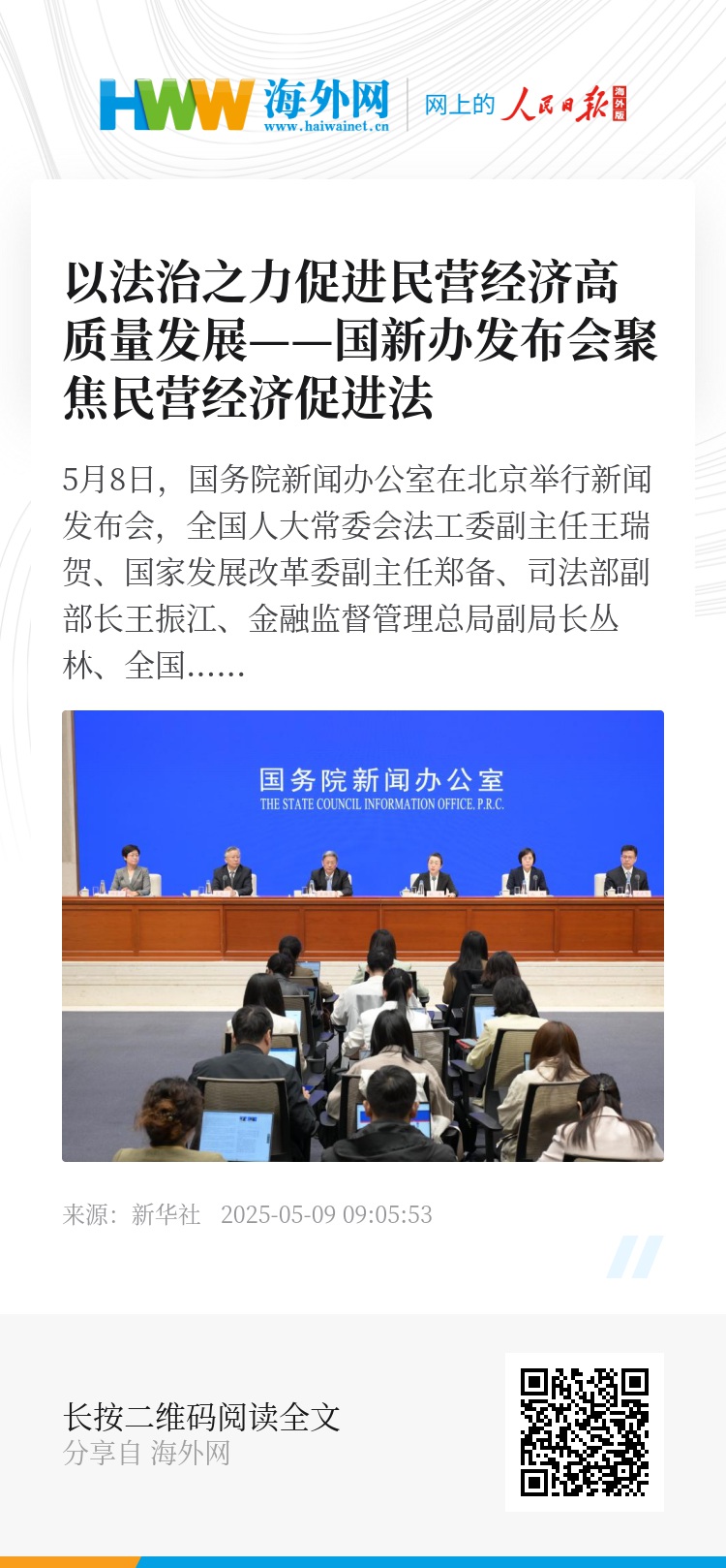 新华社北京5月8日电 题:以法治之力促进民营经济高质量发展——国新办发布会聚焦民营经济促进法
