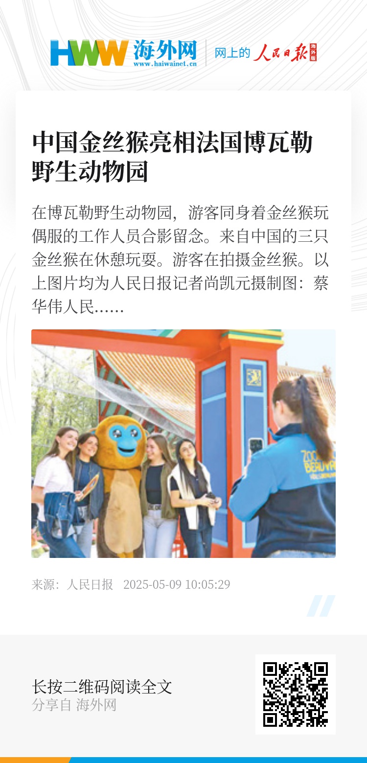 人民日报法国圣艾尼昂5月8日电(记者尚凯元)来自中国的三只金丝猴7日正式亮相法国博瓦勒野生动物园,该园还为这批金丝猴举行了命名仪式。