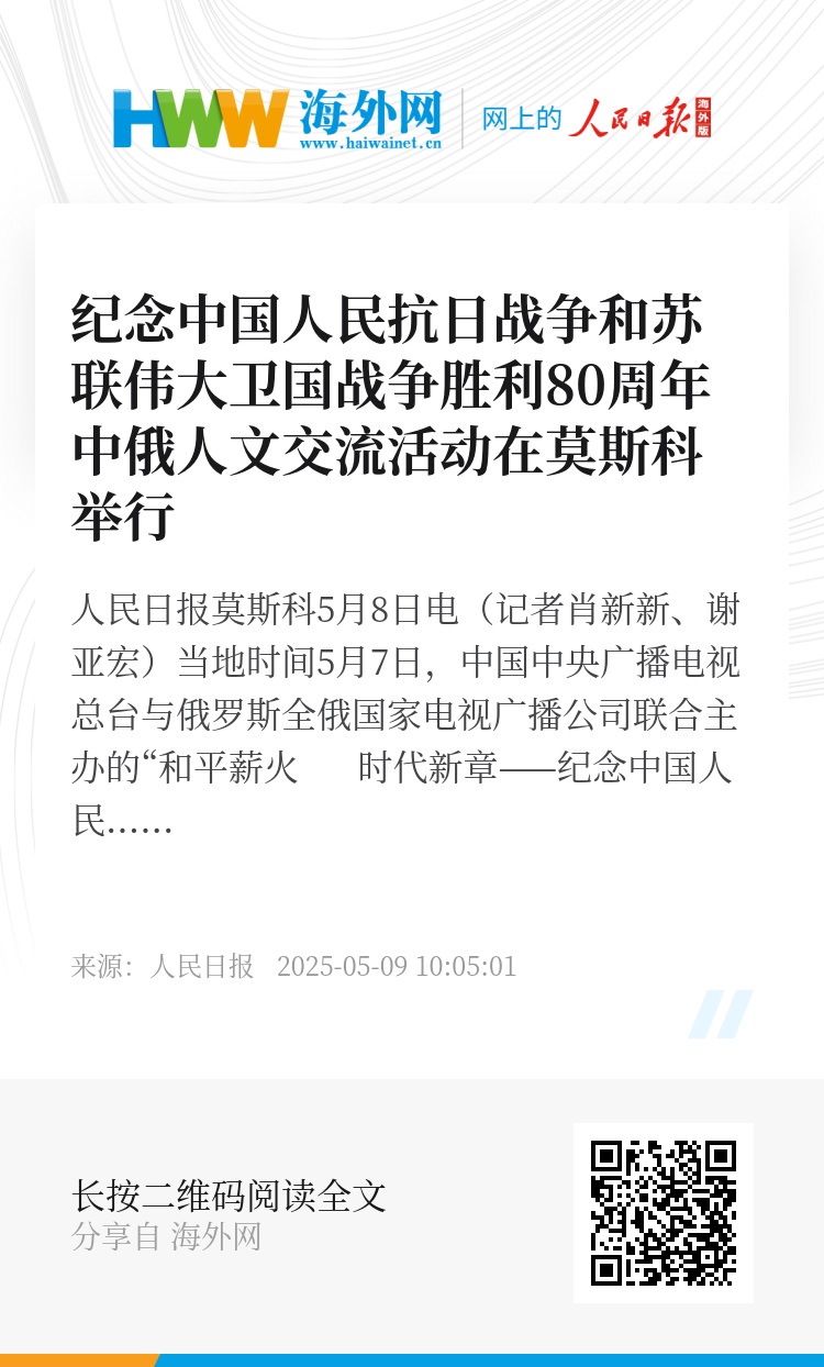 人民日报莫斯科5月8日电(记者肖新新、谢亚宏)当地时间5月7日,中国中央广播电视总台与俄罗斯全俄国家电视广播公司联合主办的“和平薪火 时代新章——纪念中国人民抗日战争和苏联伟大卫国战争胜利80周年中俄人文交流活动”在莫斯科举行。活动上宣读了中国国家主席习近平和俄罗斯总统普京的贺信。