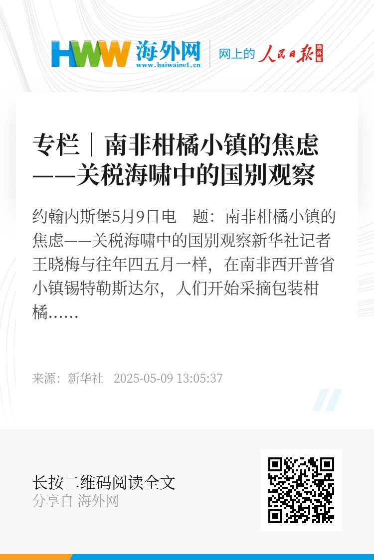 新华社约翰内斯堡5月9日电 题:南非柑橘小镇的焦虑——关税海啸中的国别观察