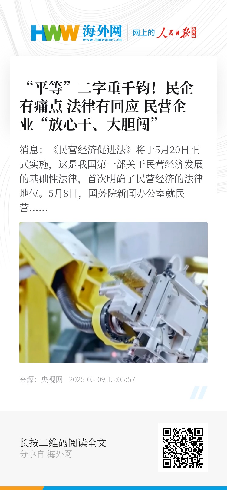 在5月8日的发布会上,国家发展改革委副主任郑备表示,《民营经济促进法》全文贯穿了平等对待、公平竞争、同等保护、共同发展的原则。在总则和公平竞争、投资融资促进、科技创新、法律责任等章节中,都予以了充分体现。国家发展改革委将会同有关部门重点从破壁垒、拓空间、优服务三个方面强化举措。
