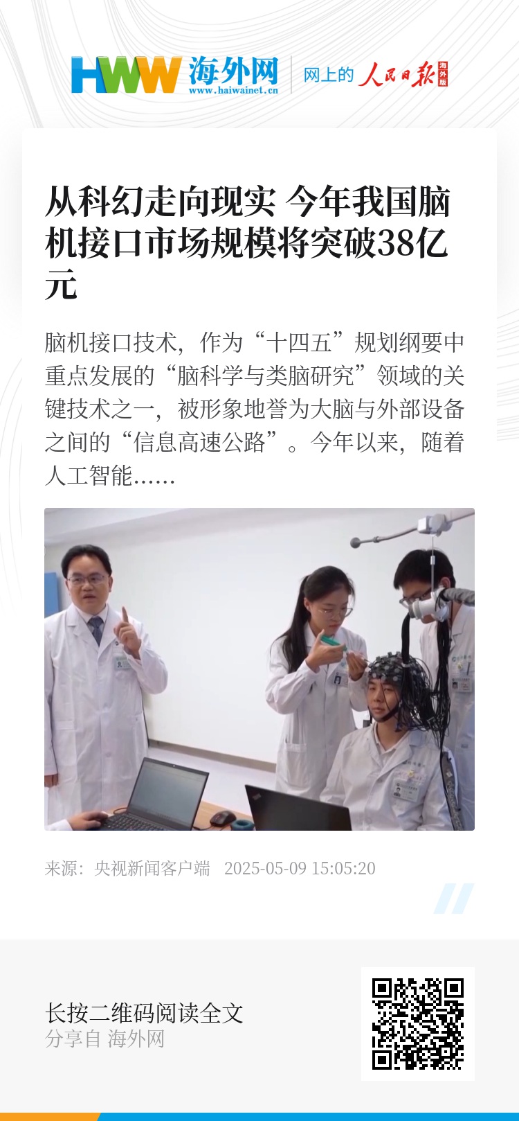 赛迪研究院信息化与软件产业研究所副主任 黄文鸿:随着脑机接口领域创新成果持续涌现,其在医疗领域的应用将持续深化,消费、工业、教育等领域应用也将加快拓展,有望推动市场规模进一步扩大。