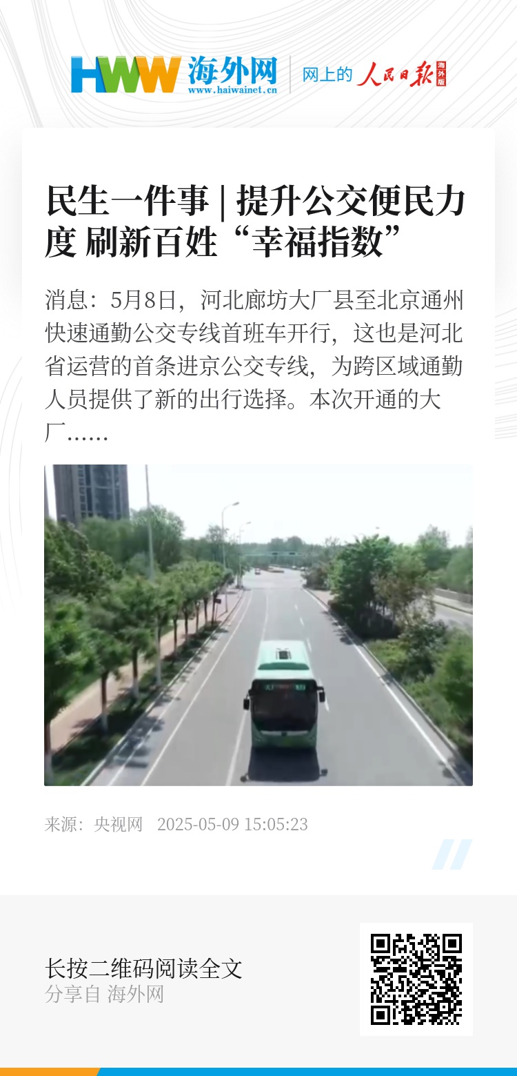 央视网消息:5月8日,河北廊坊大厂县至北京通州快速通勤公交专线首班车开行,这也是河北省运营的首条进京公交专线,为跨区域通勤人员提供了新的出行选择。