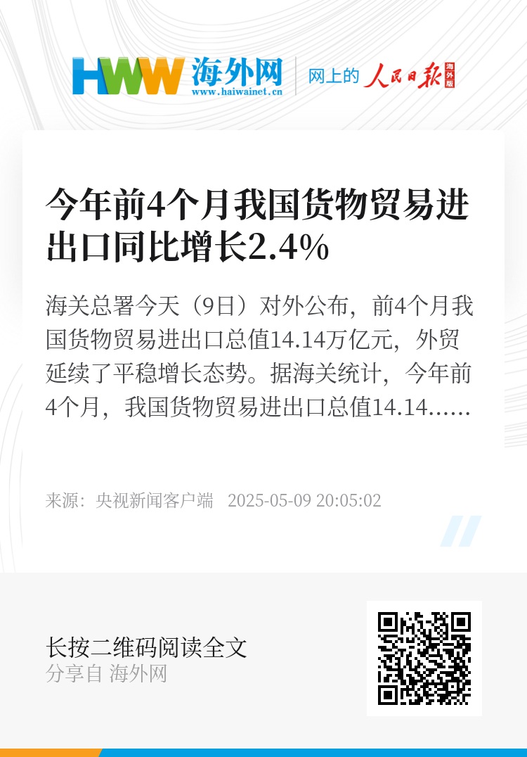海关总署今天(9日)对外公布,前4个月我国货物贸易进出口总值14.14万亿元,外贸延续了平稳增长态势。