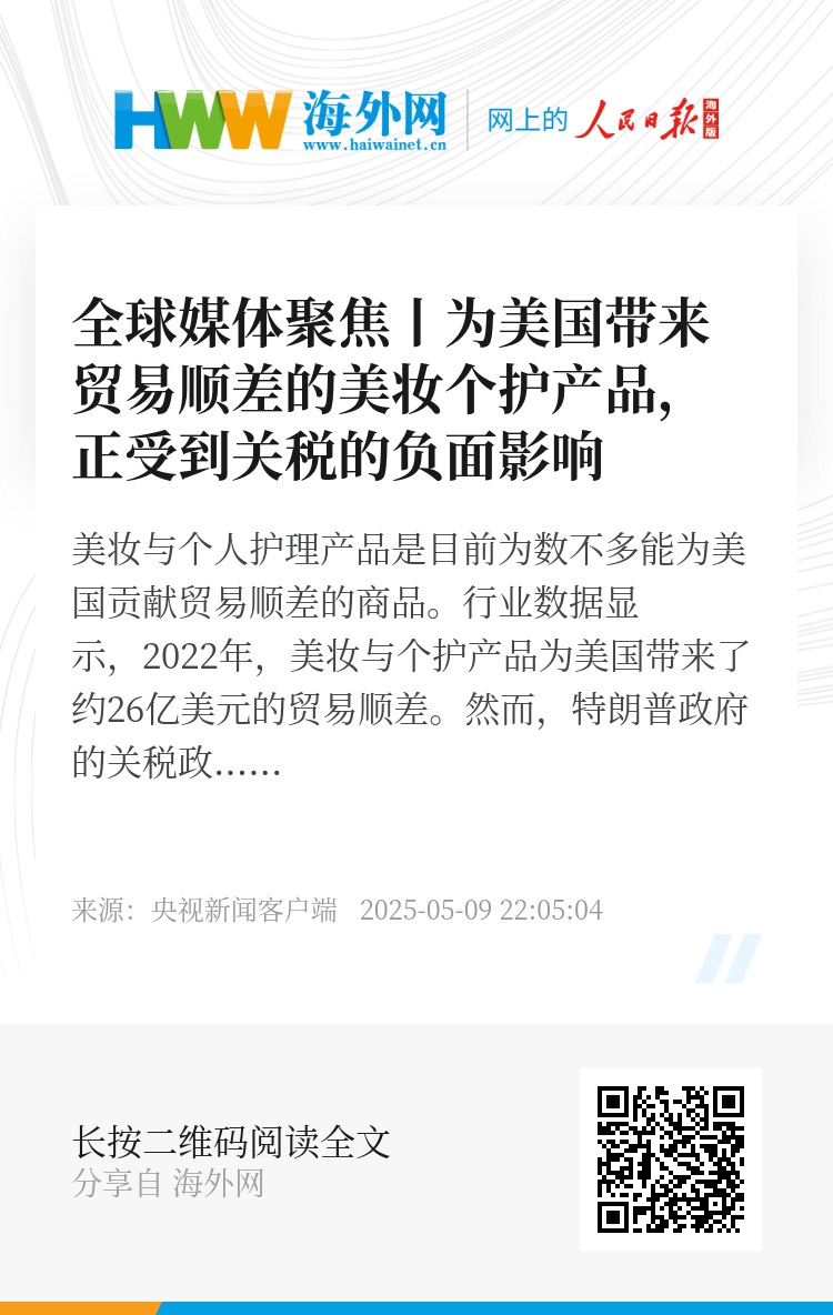 《华盛顿邮报》网站近期发布的一篇文章聚焦了关税对美国美妆与个护产品制造业的影响。报道称,在行业和分析人士看来,美国政府加征的高额关税扰乱了美妆产品的供应链,这一政策实际上会阻碍这一数十年来美国具备国际竞争优势的行业的发展。