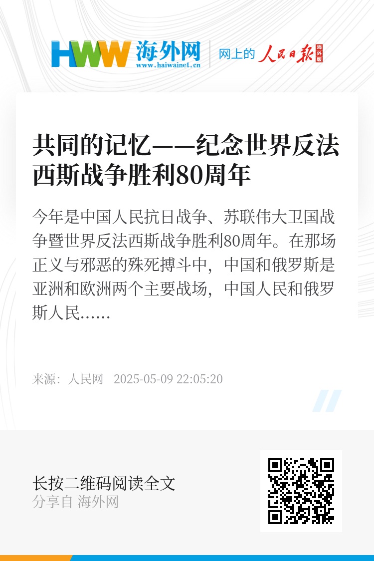 今年是中国人民抗日战争、苏联伟大卫国战争暨世界反法西斯战争胜利80周年。在那场正义与邪恶的殊死搏斗中,中国和俄罗斯是亚洲和欧洲两个主要战场,中国人民和俄罗斯人民是抗击法西斯主义和军国主义的两支中坚力量。