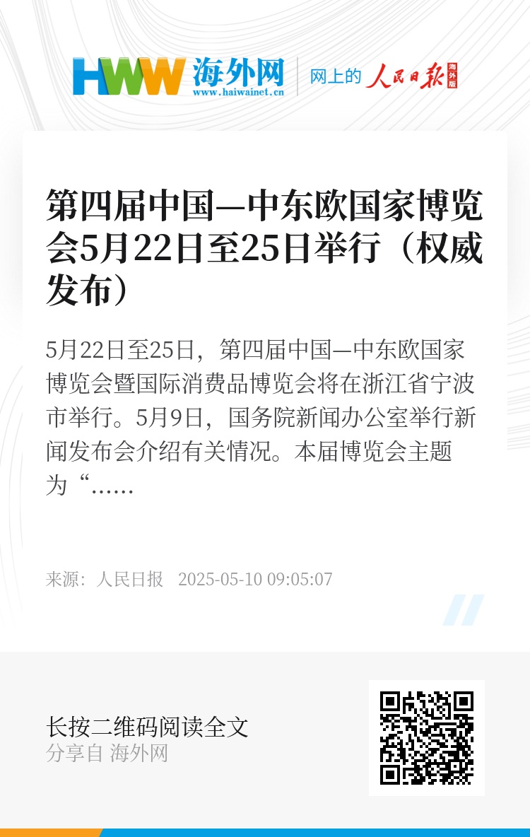 5月22日至25日,第四届中国—中东欧国家博览会暨国际消费品博览会将在浙江省宁波市举行。5月9日,国务院新闻办公室举行新闻发布会介绍有关情况。
