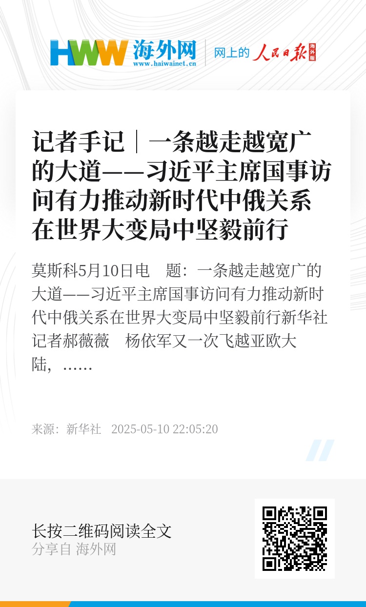 新华社莫斯科5月10日电 题:一条越走越宽广的大道——习近平主席国事访问有力推动新时代中俄关系在世界大变局中坚毅前行