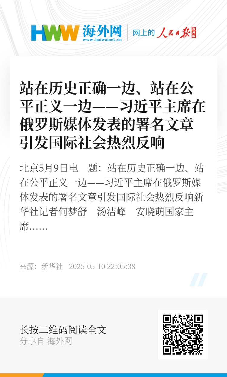 新华社北京5月9日电 题:站在历史正确一边、站在公平正义一边——习近平主席在俄罗斯媒体发表的署名文章引发国际社会热烈反响