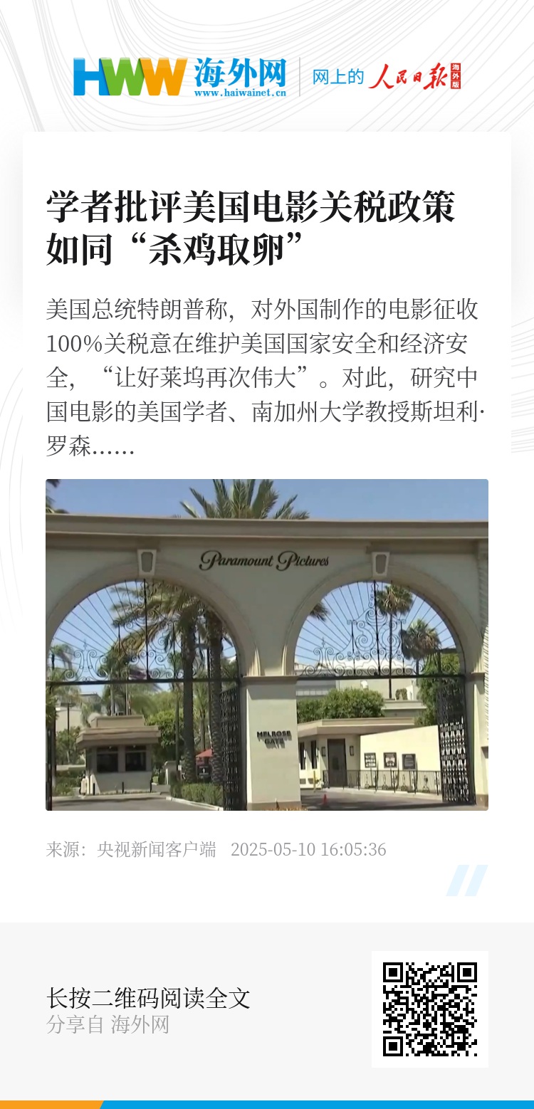 美国总统特朗普称,对外国制作的电影征收100%关税意在维护美国国家安全和经济安全,“让好莱坞再次伟大”。对此,研究中国电影的美国学者、南加州大学教授斯坦利·罗森9日接受央视记者采访时表示,美国政府的做法不切实际,若实施,反将损害美国电影产业。