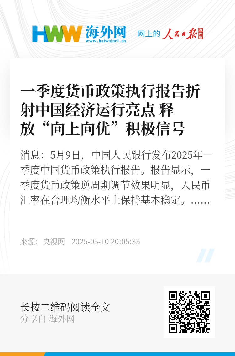 央视网消息:5月9日,中国人民银行发布2025年一季度中国货币政策执行报告。报告显示,一季度货币政策逆周期调节效果明显,人民币汇率在合理均衡水平上保持基本稳定。