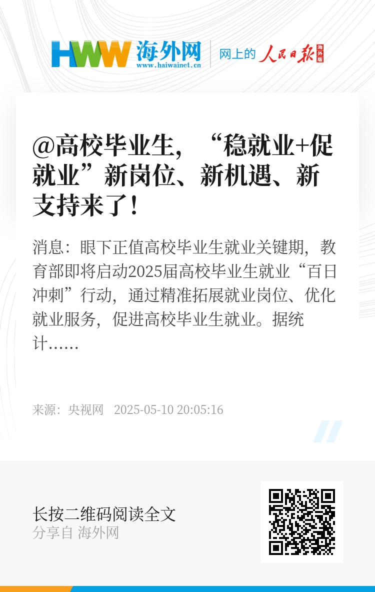 央视网消息:眼下正值高校毕业生就业关键期,教育部即将启动2025届高校毕业生就业“百日冲刺”行动,通过精准拓展就业岗位、优化就业服务,促进高校毕业生就业。