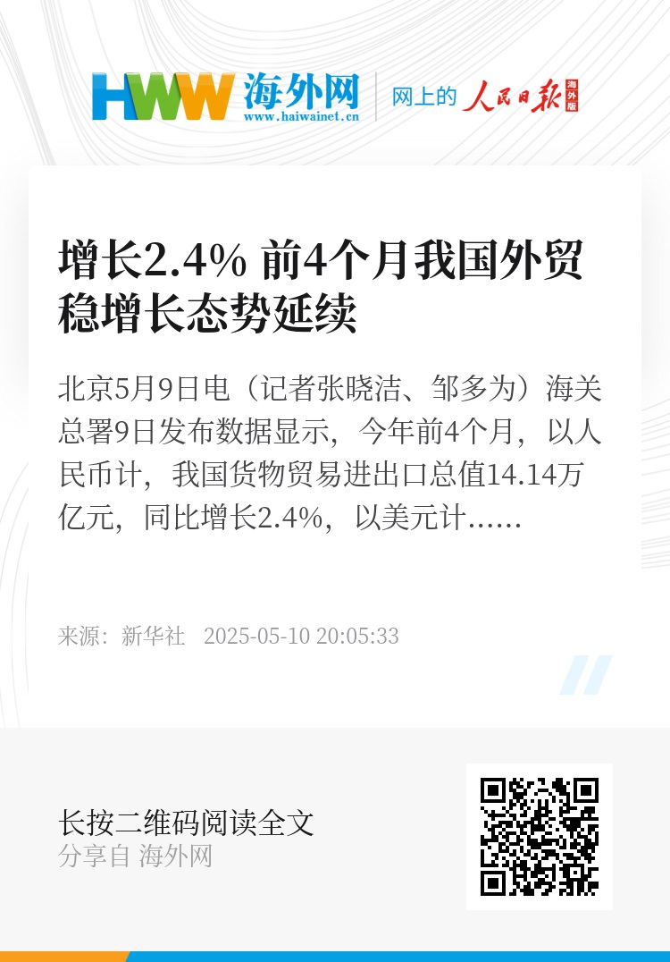 新华社北京5月9日电(记者张晓洁、邹多为)海关总署9日发布数据显示,今年前4个月,以人民币计,我国货物贸易进出口总值14.14万亿元,同比增长2.4%,以美元计,进出口增长1.3%,增速均较一季度加快1.1个百分点。其中4月份,我国进出口3.84万亿元,同比增长5.6%。与上月相比,虽出口同比增速高位小幅回落至9.3%,但进口由降转为增长0.8%。