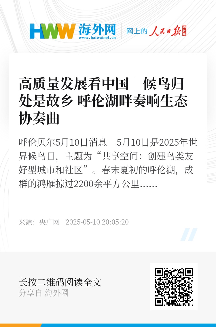 央广网呼伦贝尔5月10日消息 5月10日是2025年世界候鸟日,主题为“共享空间:创建鸟类友好型城市和社区”。春末夏初的呼伦湖,成群的鸿雁掠过2200余平方公里的湖面,翅尖轻点碧波,留下圈圈涟漪。远处,白琵鹭在浅滩悠然踱步,红嘴鸥的鸣叫与浪声交织,为呼伦贝尔草原奏响生机序章。这里是东北亚-澳大利亚候鸟迁徙的重要驿站,每年4月初至5月,数十万只候鸟跨越山海,如约飞抵内蒙古呼伦湖国家级自然保护区。