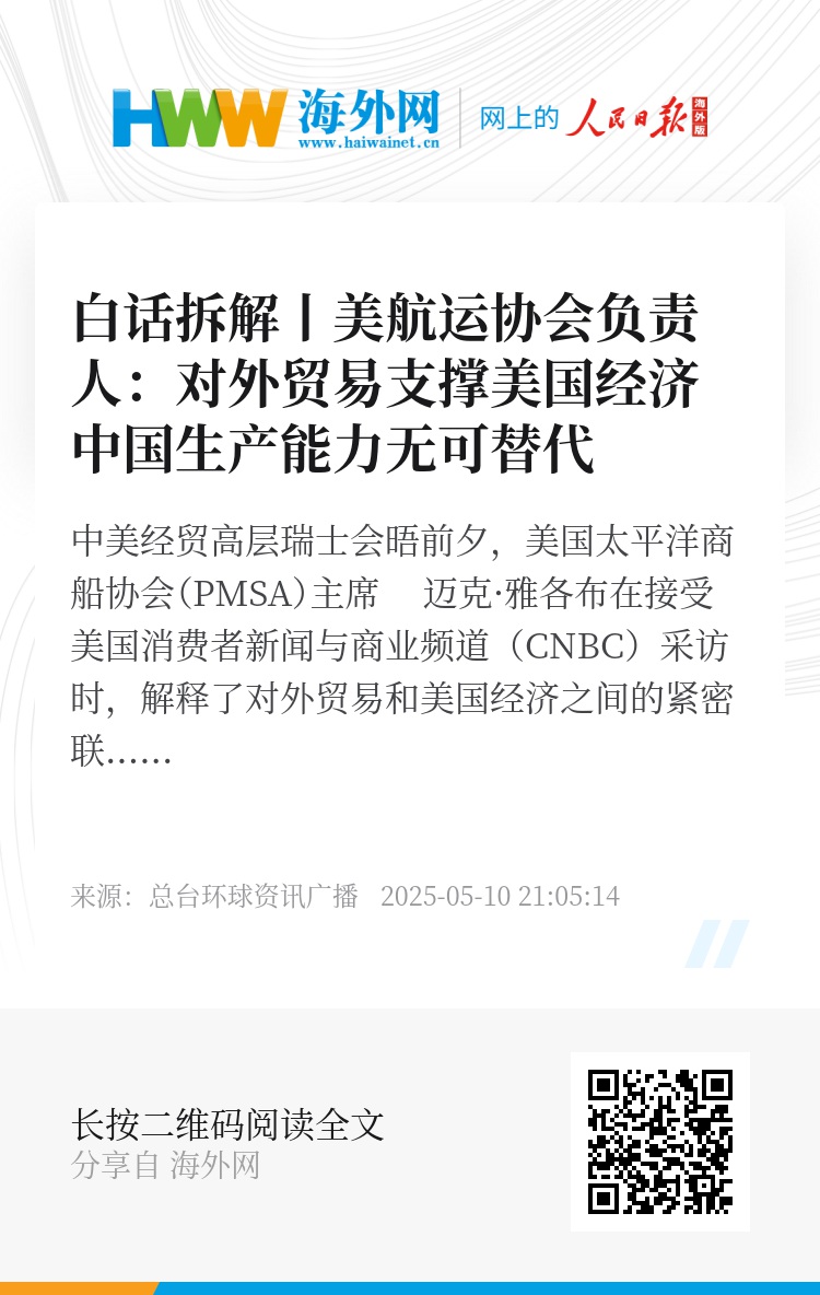 中美经贸高层瑞士会晤前夕,美国太平洋商船协会(PMSA)主席 迈克·雅各布在接受美国消费者新闻与商业频道(CNBC)采访时,解释了对外贸易和美国经济之间的紧密联系,特别是对华贸易的重要性。一起来拆一拆。