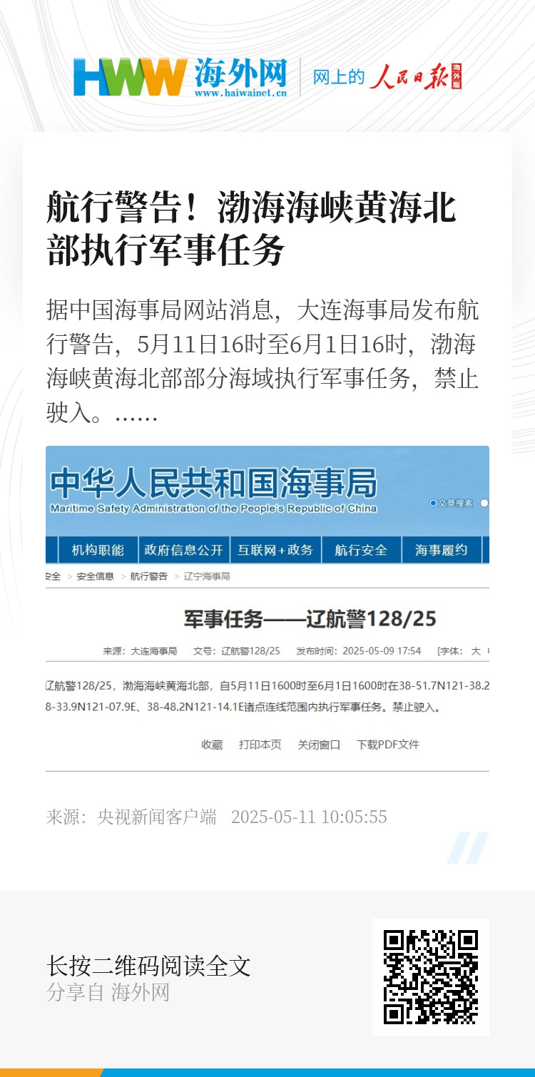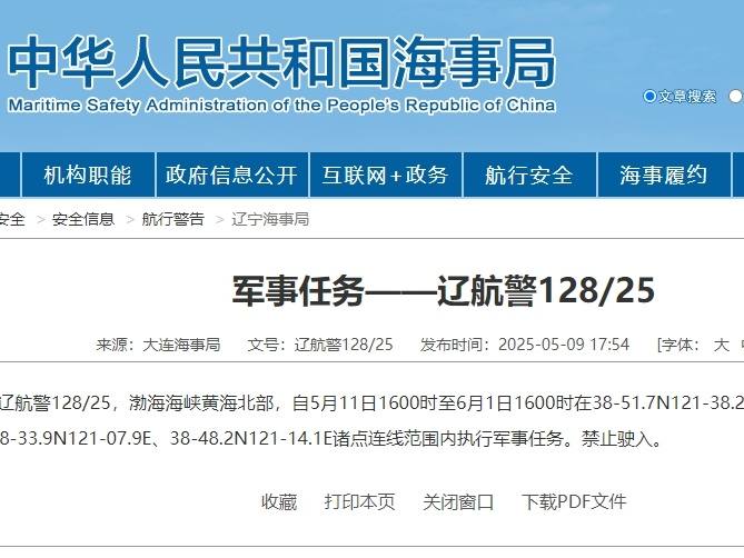 据中国海事局网站消息,大连海事局发布航行警告,5月11日16时至6月1日16时,渤海海峡黄海北部部分海域执行军事任务,禁止驶入。