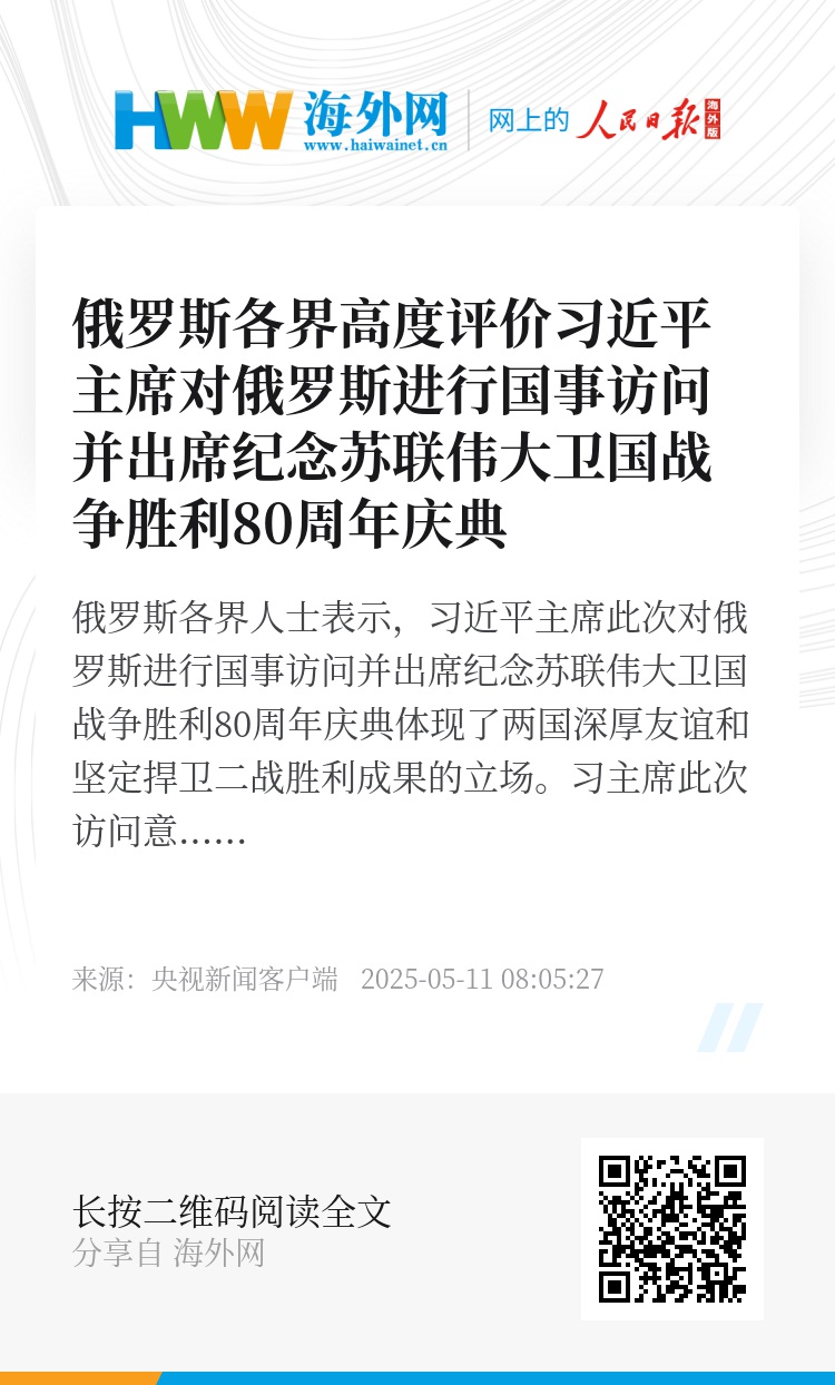 俄罗斯各界人士表示,习近平主席此次对俄罗斯进行国事访问并出席纪念苏联伟大卫国战争胜利80周年庆典体现了两国深厚友谊和坚定捍卫二战胜利成果的立场。习主席此次访问意义重大,两国领导人就一系列重要问题深入沟通并达成务实合作成果,彰显两国高度互信与相互支持,将俄中关系推向更高水平。