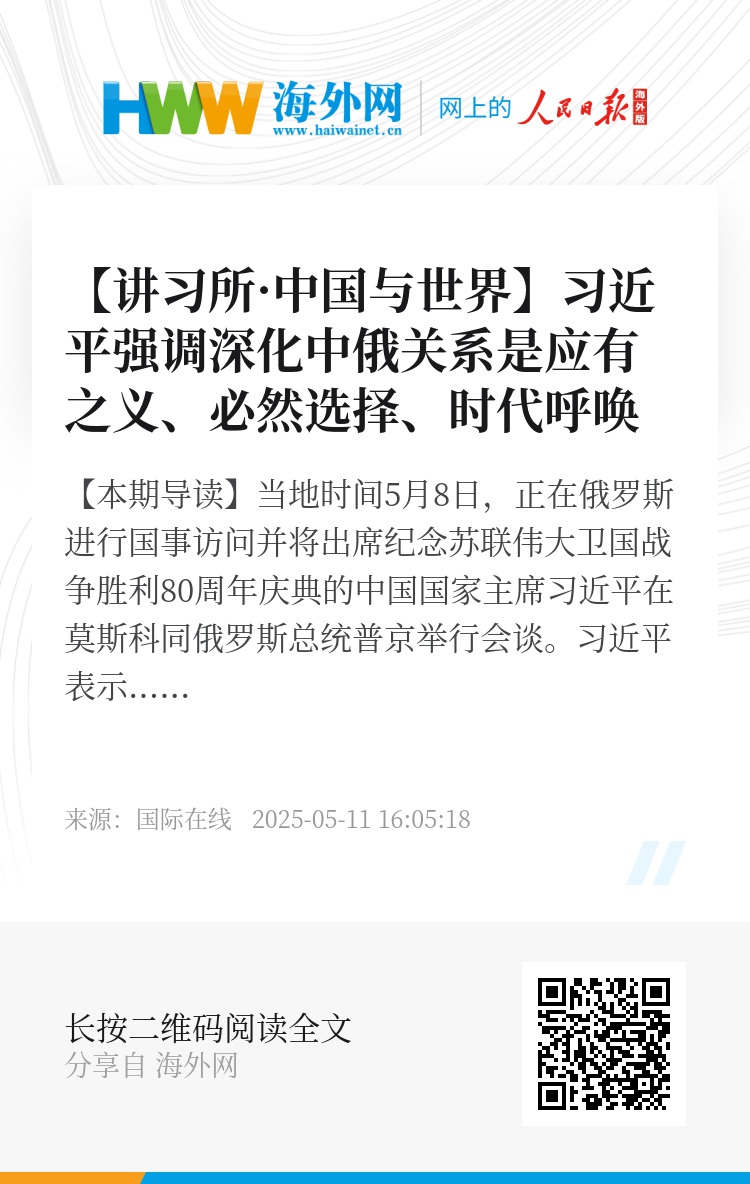 “两国人民用鲜血和生命凝结的深厚情谊,如黄河之水奔腾不息,似伏尔加河宽广深沉,成为中俄世代友好的不竭源泉。”今年是中国人民抗日战争、苏联伟大卫国战争暨世界反法西斯战争胜利80周年,也是联合国成立80周年。在这一重要历史时间节点,习近平主席此访不仅为中俄关系发展注入强劲动力,也向世界宣示中俄两国携手捍卫二战胜利成果的坚定意志。
