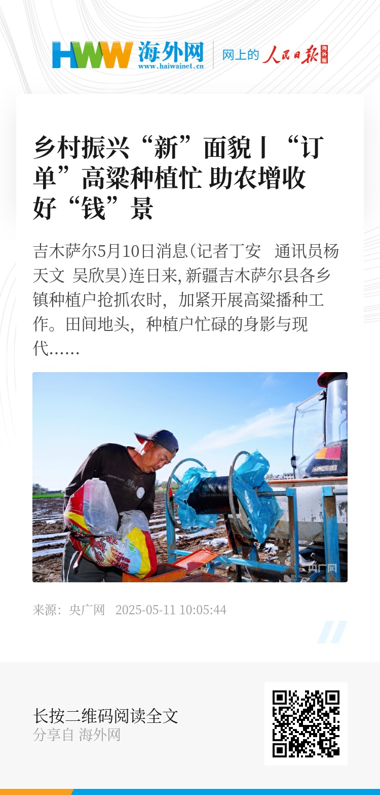 央广网吉木萨尔5月10日消息(记者丁安 通讯员杨天文 吴欣昊)连日来,新疆吉木萨尔县各乡镇种植户抢抓农时,加紧开展高粱播种工作。田间地头,种植户忙碌的身影与现代化的农业机械交织成一幅生动的农耕画卷。